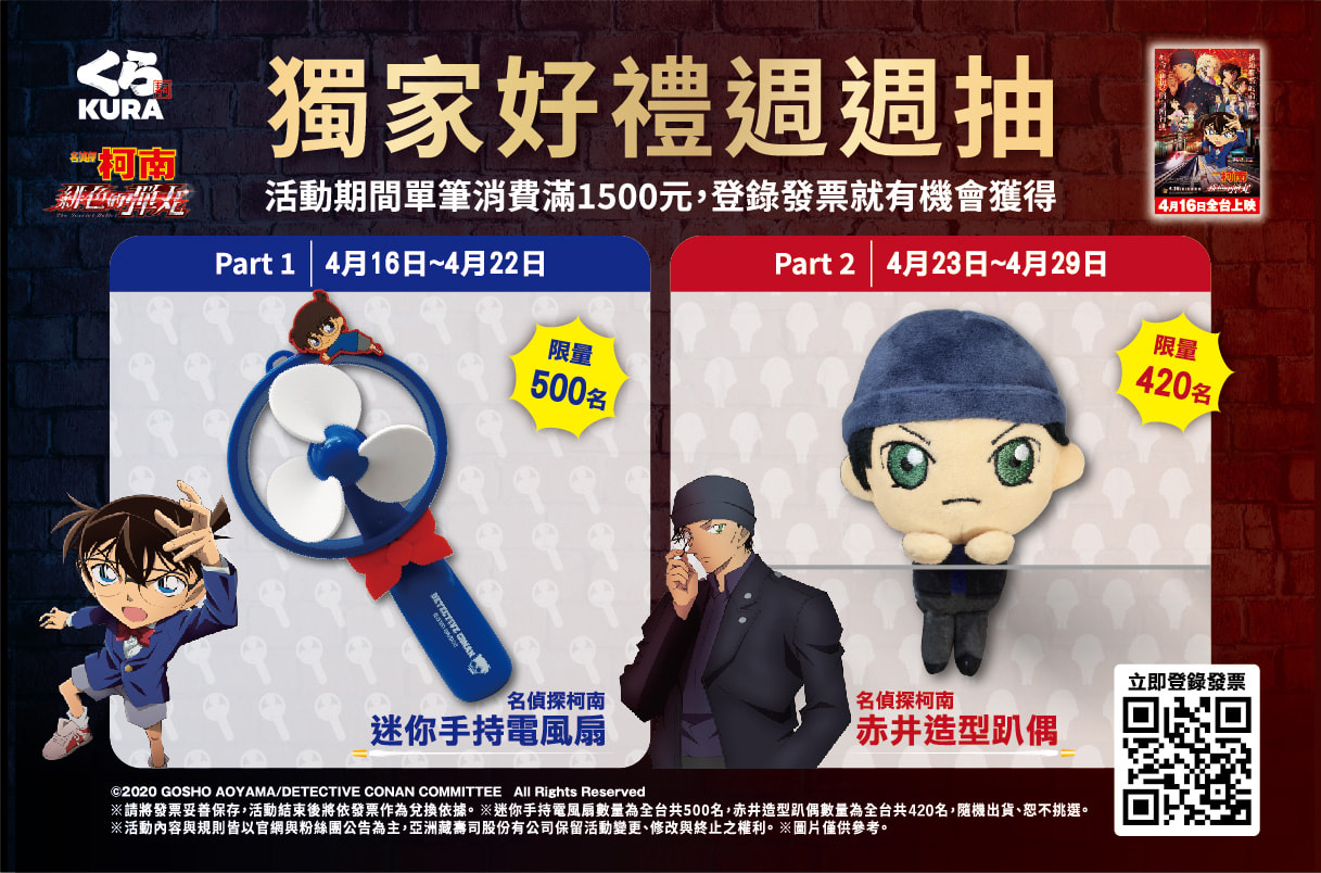 ▼另外,藏壽司為了回饋所有久等的柯南迷們,特別加碼,首度祭出週週抽的活動,每週都有滿滿的獨家好禮讓各位粉絲拿好拿滿!首週活動從4月16日開始,凡是消費滿1500元並上網登錄發票,即可有機會抽中「名偵探柯南迷你手持電風扇」為即將到來的炎炎夏日做好準備!第二週從4月23日開始,還有人氣超高的「赤井秀一造型趴偶」可愛造型能趴在各個地方,陪伴粉絲們每個歡樂時刻。
