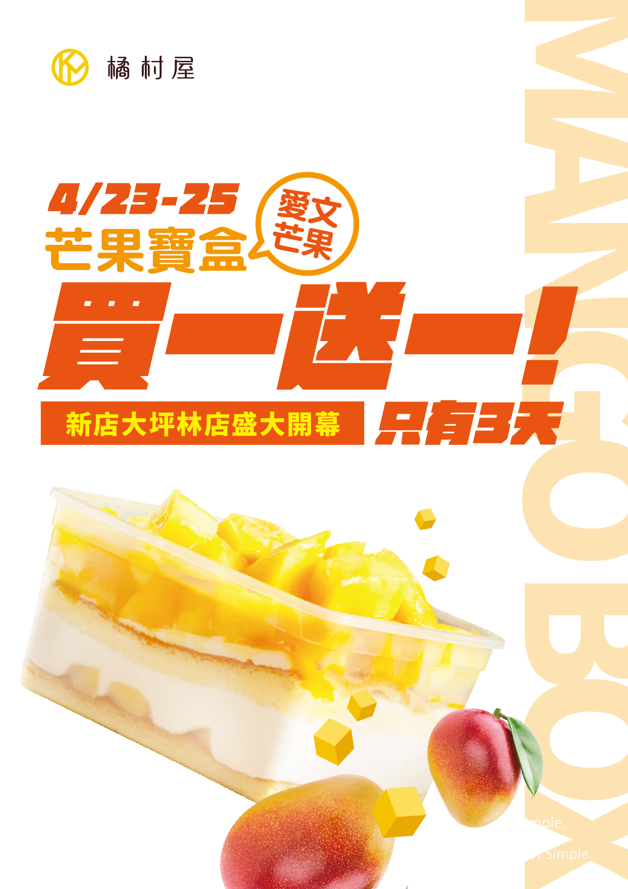 活動資訊:4/23-4/25活動期間,至新店大坪林店購買「芒果寶盒」可享「買一盒送一盒」(免費兌換券)(兌換券使用期限:4/26-7/31)