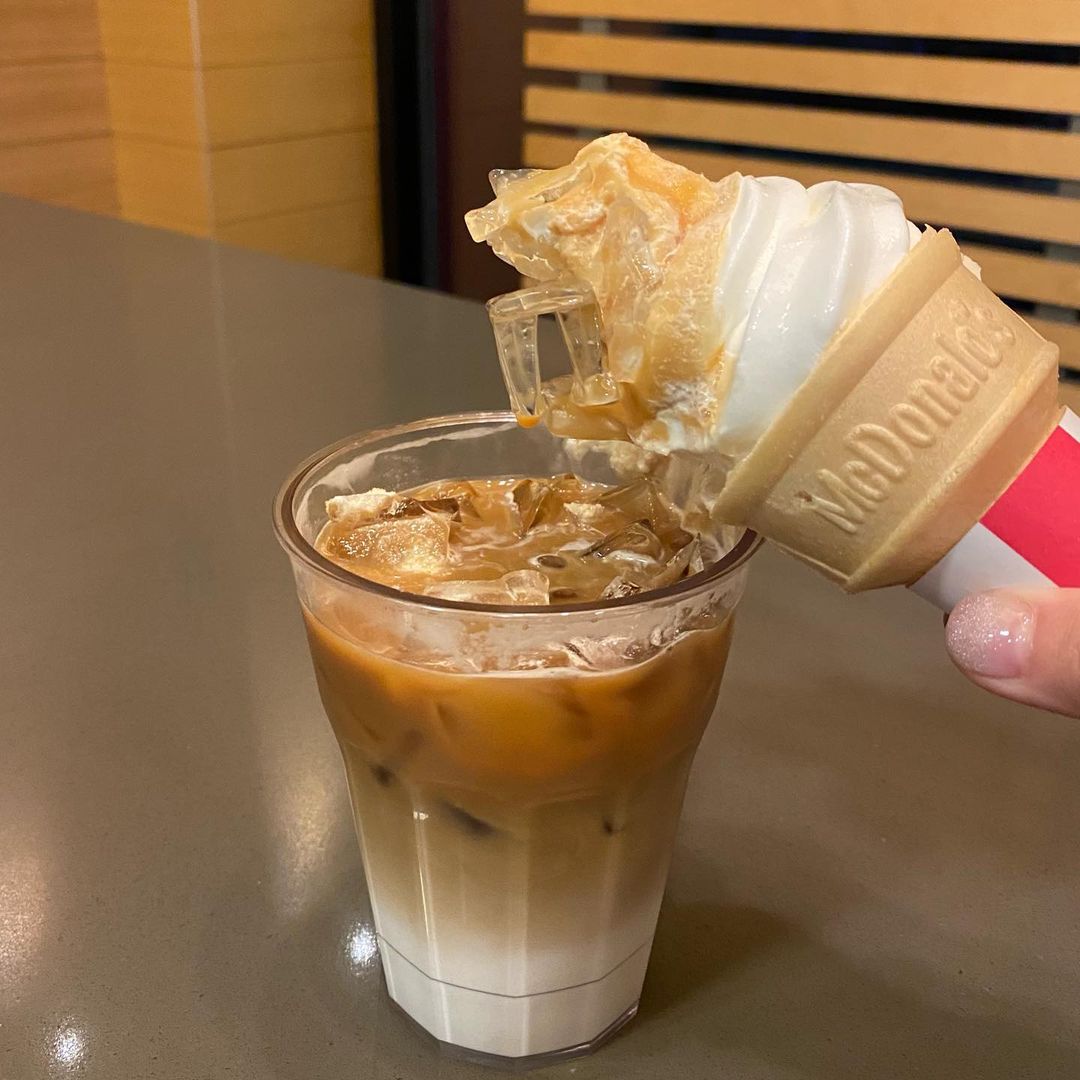 ▼韓國人最近在IG瘋傳的吃法(맥바셋),類似於咖啡廳的「Affogato阿法奇朵」,原本是把濃縮咖啡澆到冰淇淋上,讓冰淇淋在咖啡海淹沒。但想在麥當勞吃到這種品項不太可能,所以大家就發揮巧思把Ice cream加入Ice latte瞬間化身成漂浮冰咖啡(笑)。