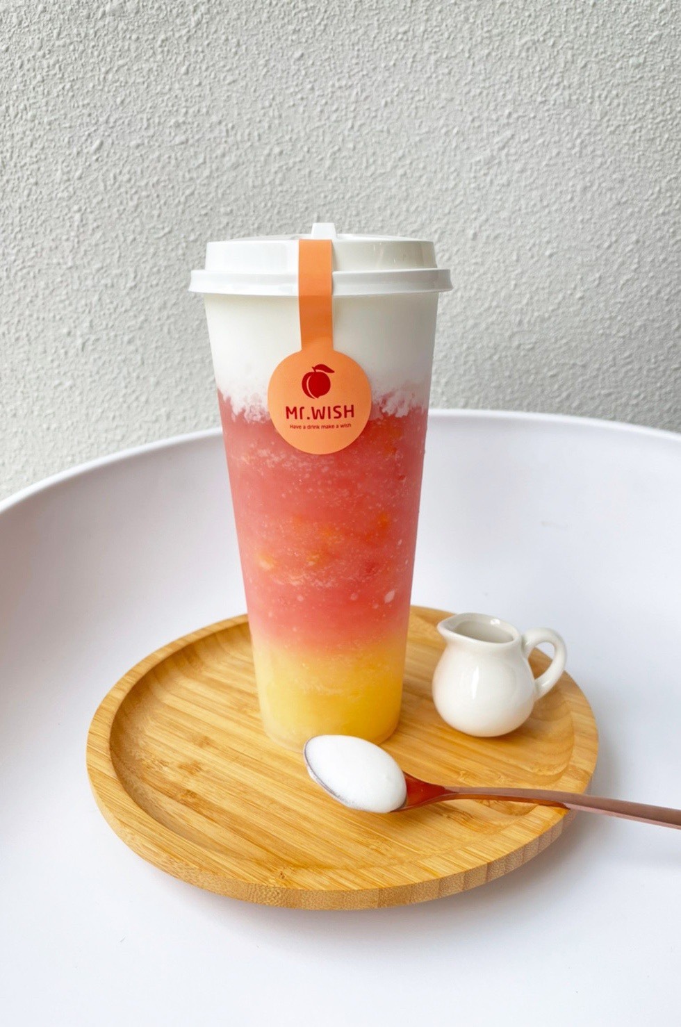 ▼同期Mr.Wish推出「桃氣芝芝」,蜜桃冰沙呈現出超美的晨曦橘粉色漸層,搭配綿密的奶蓋,濃郁的蜜桃果香搭上粉嫩的色澤,不僅在視覺上很吸睛,味道上也超級欠喝!是今年夏天不容錯過的必喝飲品!