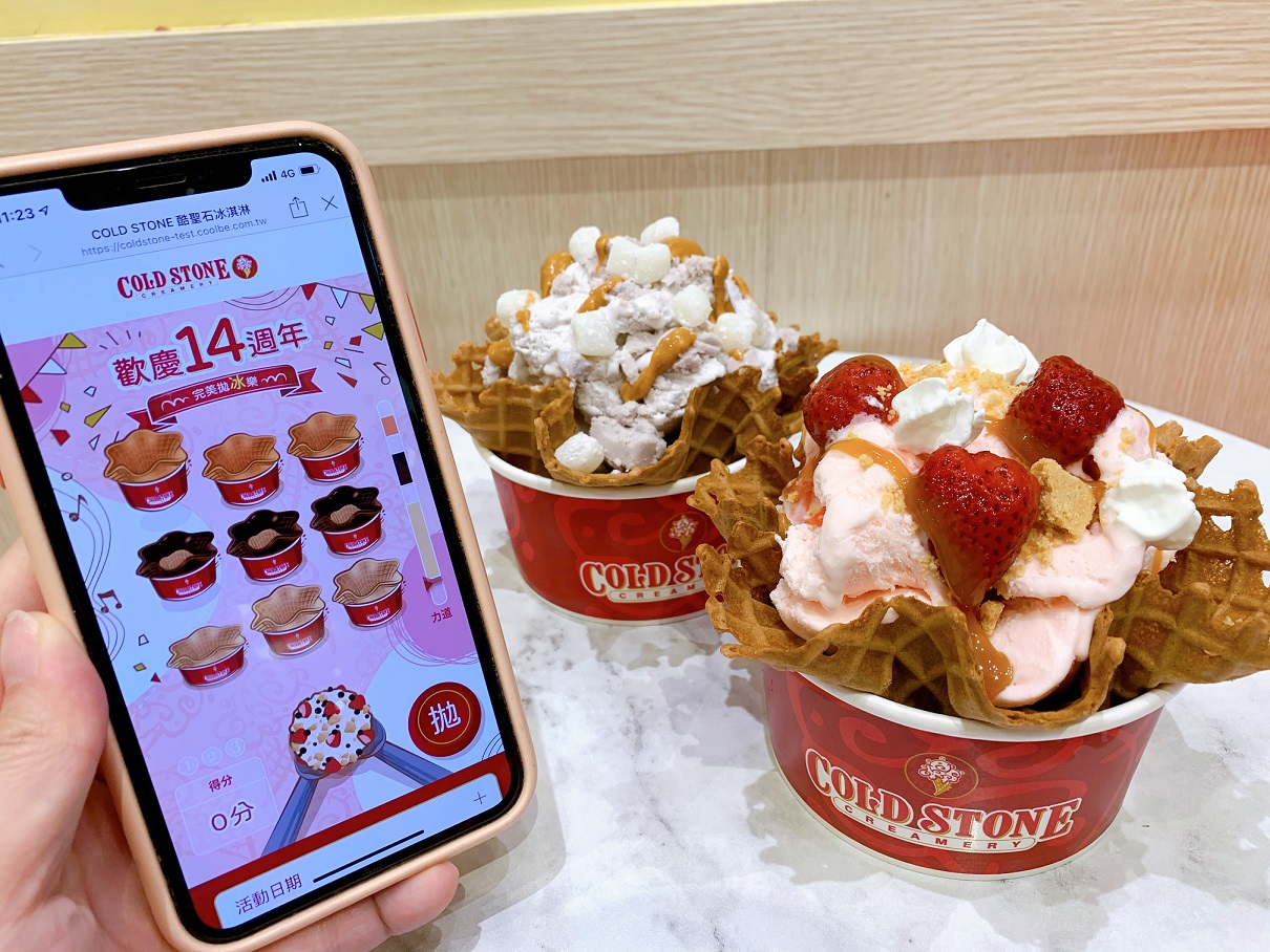 (1)天天送:活動期間每日可至COLD STONE官方LINE參加完美樂拋冰遊戲,即可獲得『冰淇淋買1送1』、『大杯冰淇淋折50元』等優惠券。