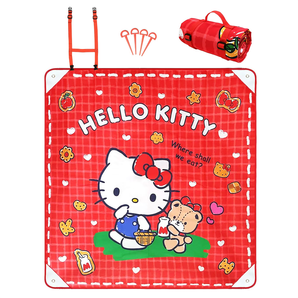 ▼另外,可收納手提的KITTY多功能萬用墊,以經典正紅與格子相間,搭配手繪風的Hello Kitty與小熊圖案,擺在草地上超吸睛。