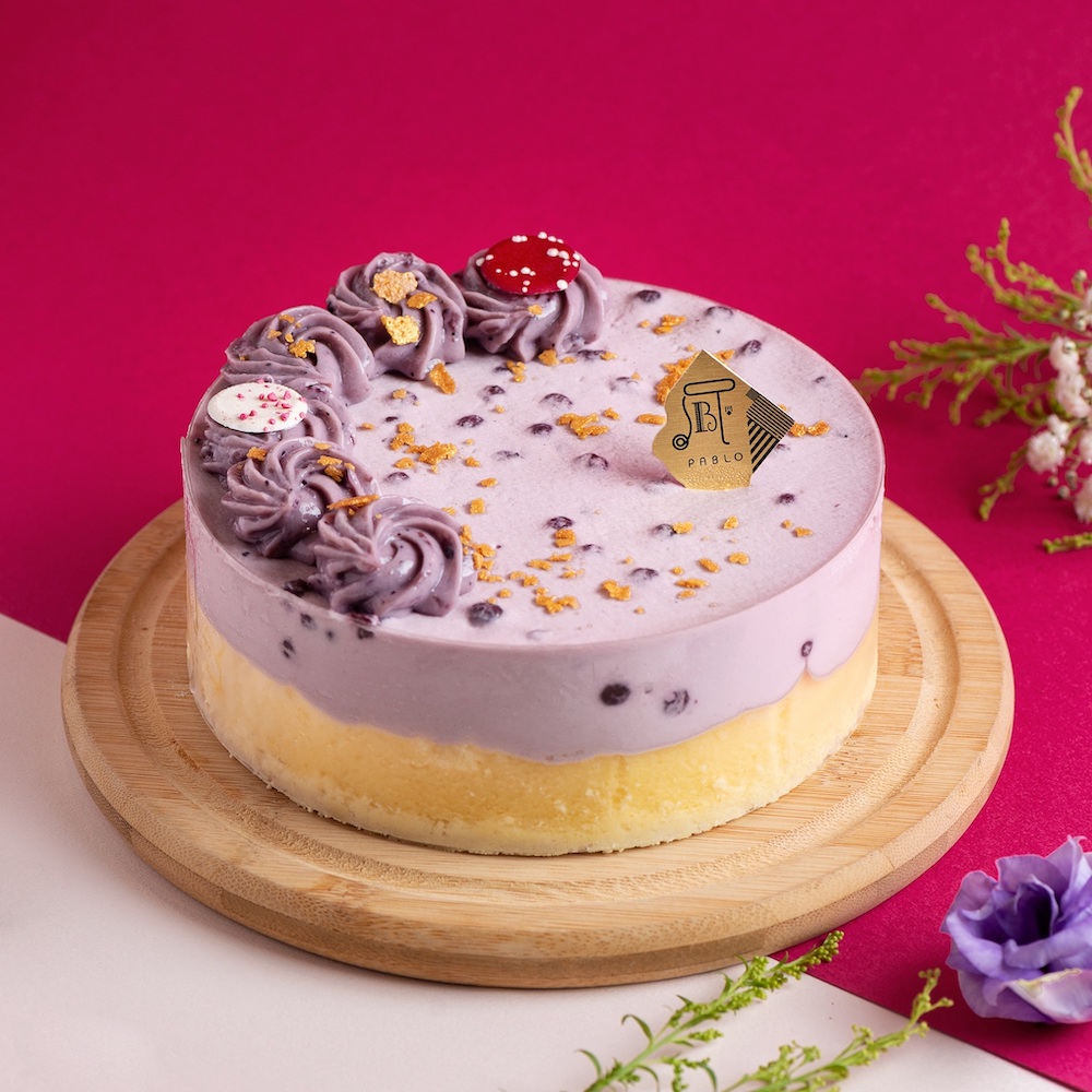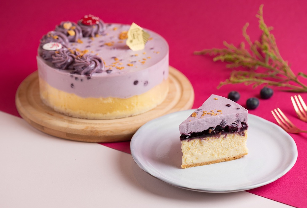▼PABLO莓好馨情「藍莓慕斯起司塔」,使用精選兩種起司奶酪烘烤而成的PABLO金牌起司塔為基底,向上一層層的堆疊,夾層淋上果粒分明、清爽酸甜的愛迪亞ALDIA藍莓果餡,再覆蓋上由藍莓果餡及鮮奶油製成的淡紫色藍莓慕斯,於塔面擠上藍莓果餡與卡士達醬拌勻的花朵,最後撒上脆片及金粉製成的金箔脆餅點綴,優雅中帶點奢華乍現。