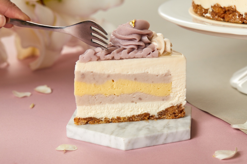 ▼外型典雅的「香濃花芋蛋糕」以顆粒感的脆餅為底,鋪上白巧克力慕斯,夾入香滑的法式布丁與芋頭泥,再鋪上一層白巧克力慕斯,最後擠上芋頭香緹並以金箔點綴,增添華麗感,入口滿溢芋頭香氣,口感柔順不膩,讓媽咪每一口都驚艷。