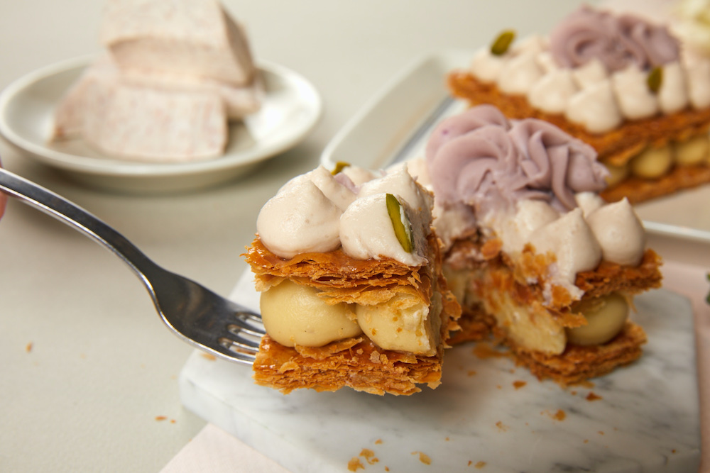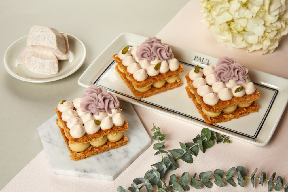 ▼PAUL人氣款千層派口味再創新!獨家研發「芋泥千層派」讓芋頭控為之失去控制!以兩片法國直送的派皮擠入主廚特製的芋泥卡士達,最後在派皮表層擠上芋頭香緹、芋泥擠花與開心果點綴,入口後交織著酥脆派皮、柔順的卡士達與香氣四溢的芋頭香,共同在舌尖轉為幸福的甜蜜口感。