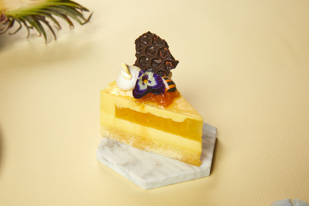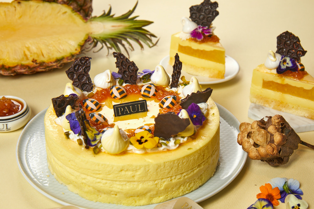 ▼今年最夯水果「鳳梨」也來湊一咖,榮登最佳人氣寶座!PAUL將2021年度話題水果「鳳梨」融合其中,主廚研發「晶鑽飛舞蛋糕」,以法國進口的白巧克力融合新鮮鳳梨製成的慕斯與主廚特製的鳳梨布丁,分層夾於海綿蛋糕內,最後鋪上手工熬煮的焦糖鳳梨,並以蜂蜜香緹、蜂巢巧克力點綴,從中帶出家人團聚的歡樂印象。