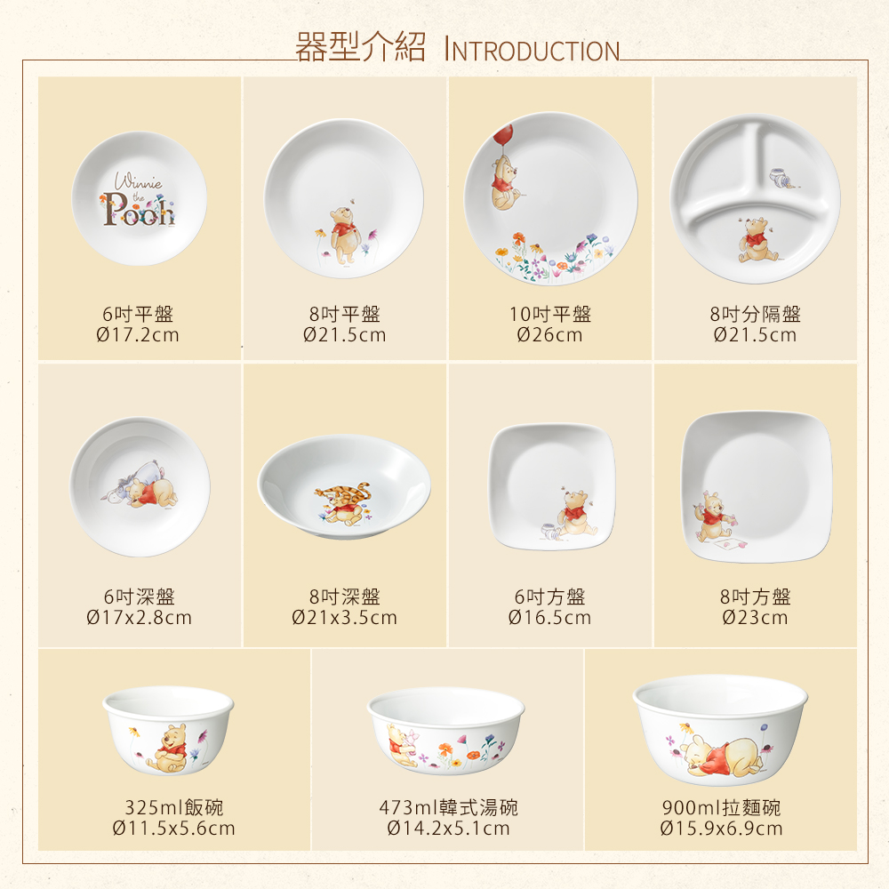 ▼此次推出的小熊維尼款式的餐碗盤,在圖樣上面除了以小熊維尼各式的可愛動作及表情為主角外,其他的角色,跳跳虎、屹耳等朋友也一起躍入圖面,與小熊維尼精彩互動,成為康寧餐具小熊維尼款式新品,勢必成為令人愛不釋手的餐桌夥伴!
