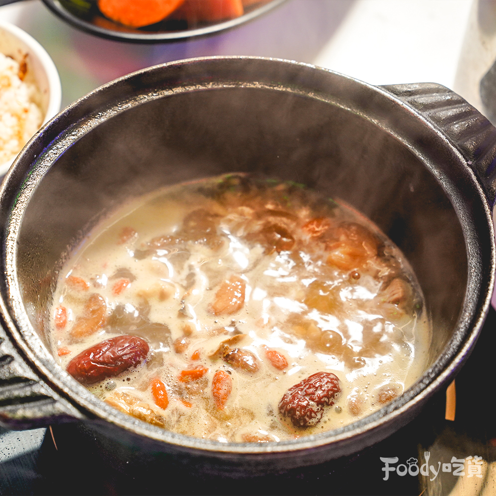 ▼另外也不能錯過桌邊現炒湯頭「爆炒蒜頭蛤蜊雞湯」,添加枸杞、紅棗等藥材最適合溫補,搭配鮮甜雞肉與蒜香,湯頭喝起來就是美味。