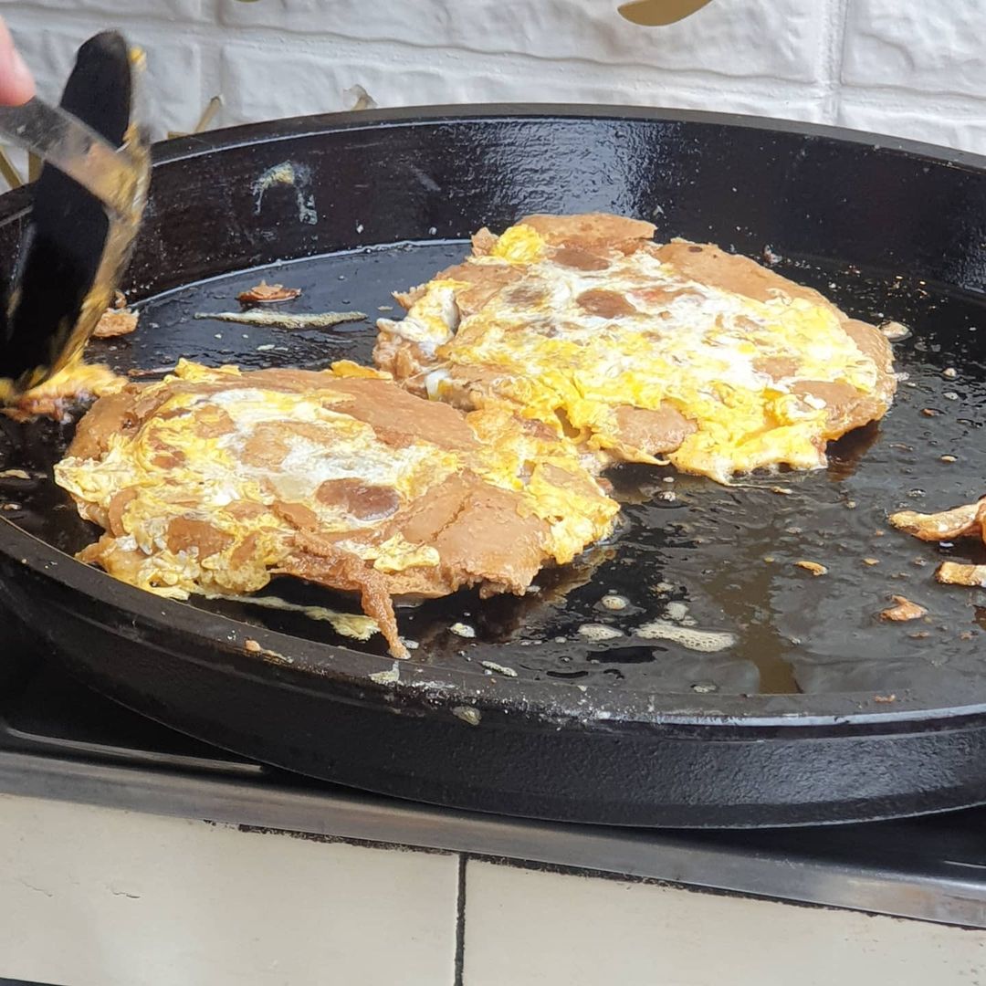 ▼椪餅先挖出一個洞,麻油熱鍋後洞口朝上開始煎椪餅,往洞裡加入雞蛋、龍眼乾、薑片等,最後整塊椪餅連蛋一起壓碎煎熟,椪餅巴附了麻油香氣,鹹香滋味更凸顯出椪餅中樸實的香甜,作法非常簡單卻讓許多老饕都流口水~