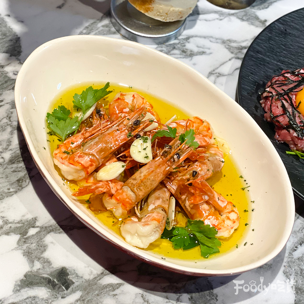 ▼西班牙橄欖油蒜香爆蝦:道地西班牙Tapas下酒菜,以初榨橄欖油與大量蒜片極拌炒新鮮草蝦,彈牙鮮蝦在濃郁飽滿的蒜香襯托下更為鮮甜美味,搭配沁涼啤酒甚是對味。