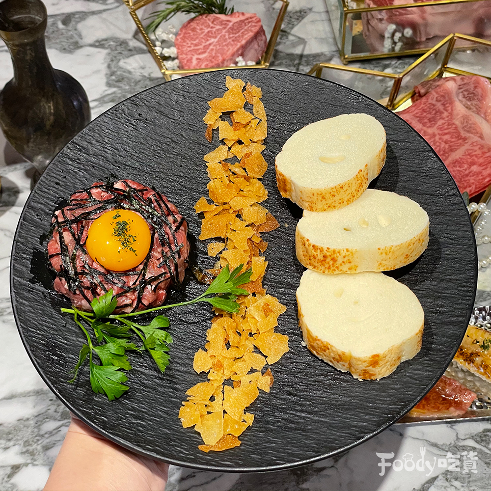 ▼生牛肉塔塔:選用日本和牛與澳洲和牛各半,取日本和牛的油脂香氣與澳洲和牛的肉感風味,讓整體口感更為均衡。細工手切,拌入鹹甜有致的特製燒肉醬,撒上蝦夷蔥提味,將飽滿濃郁的人道放牧靈芝蛋黃與生牛肉、油條碎拌勻享用,軟脆交錯的豐富口感,亦可搭配炭烤至外酥內軟的起司軟法享用。