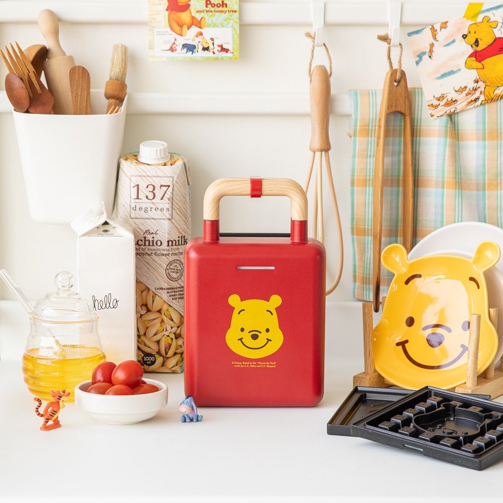 ▼人氣滿滿的小熊維尼熱壓三明治機也是必收清單之一!亮紅色外觀搭配木製把柄,除了體積小好收納以外,另外還有三種不同的烤盤樣式可以搭配,分別是一般鬆餅、維尼臉型鬆餅以及維尼吐司烤盤等,不用特地跑咖啡廳也能自製出美味三明治和鬆餅,便利度和Q度一次滿足~