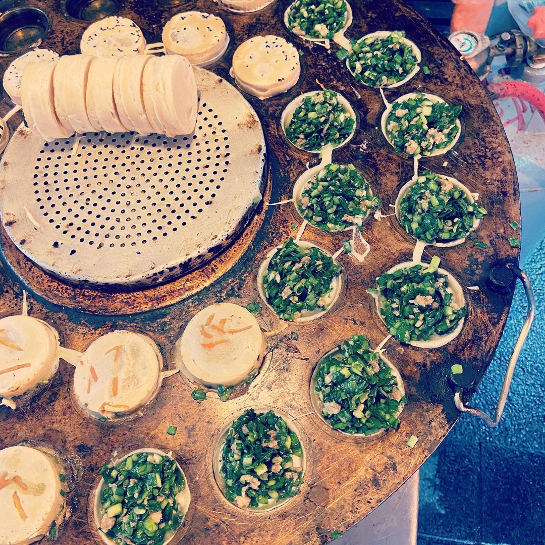 ▼一格格的車輪餅轉盤上塞了滿滿的韭菜,除了綠油油一片看了很療癒,韭菜香氣也是直撲鼻,讓人垂涎欲滴。