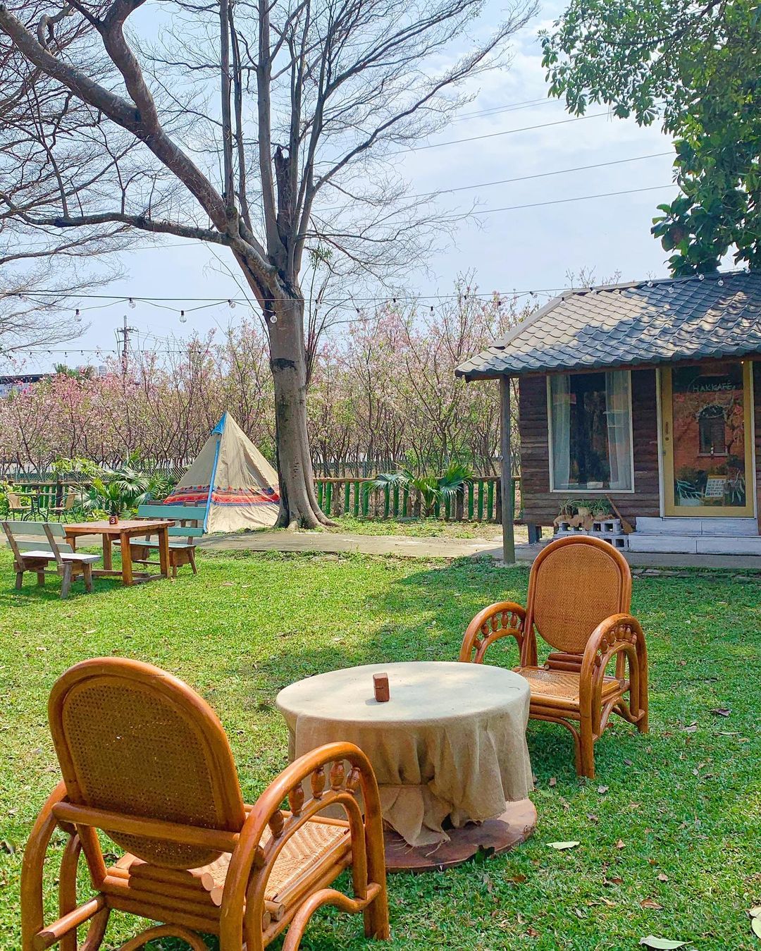 ▼戶外綠地庭園空間相當寬敞,以木製傢俱以及小帳篷妝點,桌上簡單的放置桌牌,讓客人可以自由享受日光以及餐點。