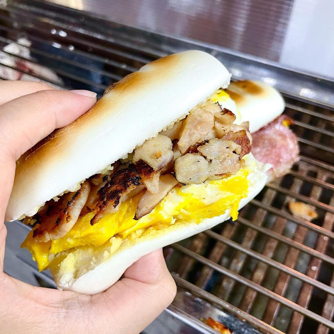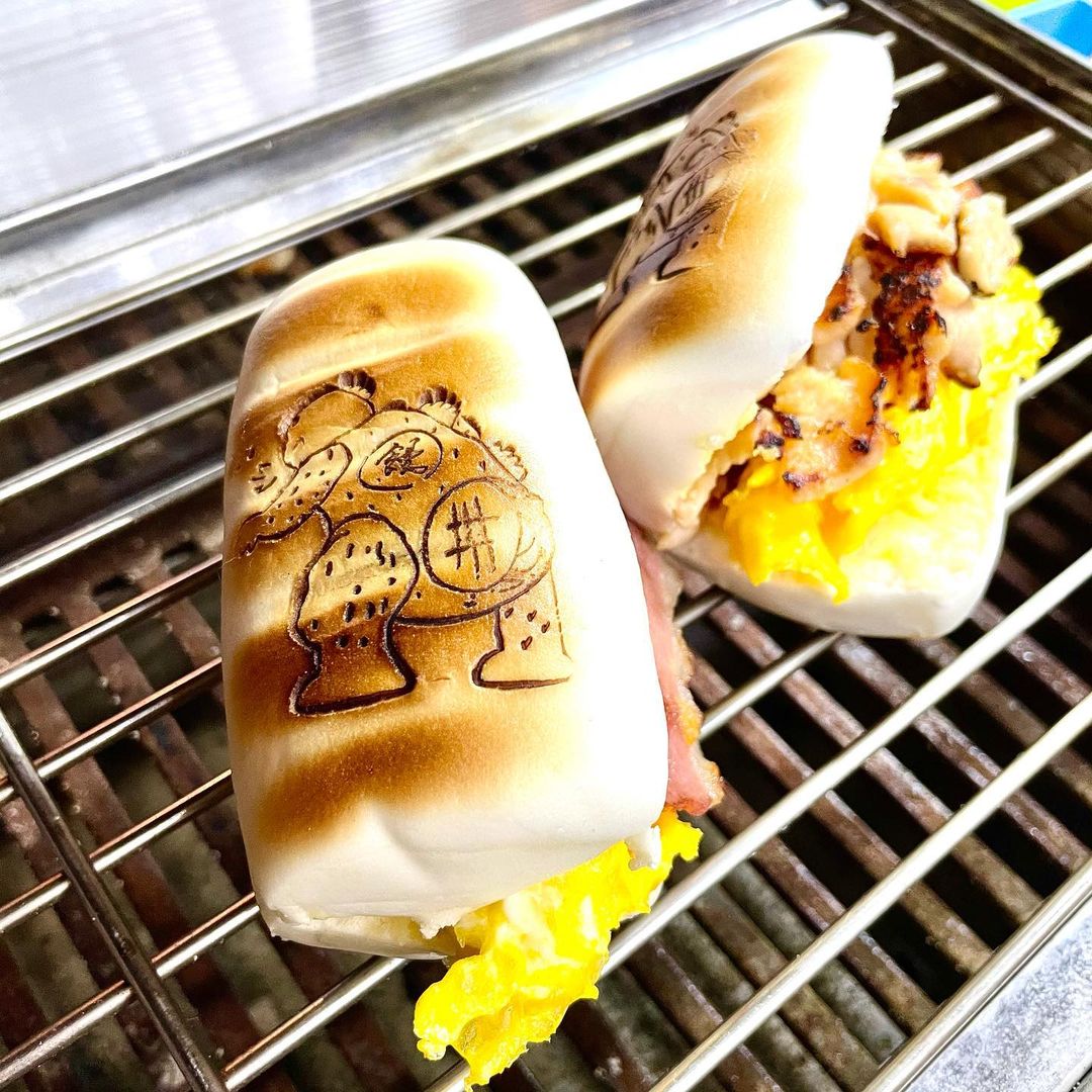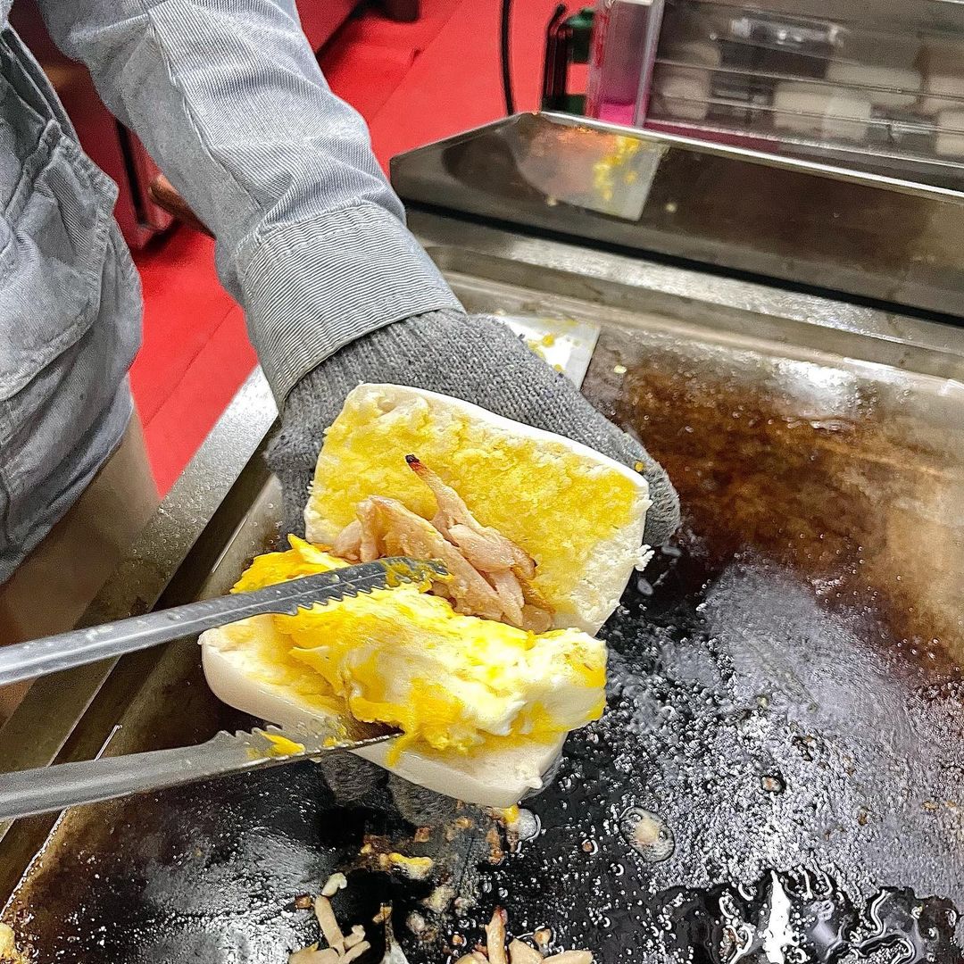 ▼一邊烤饅頭,另一邊煎台也沒有閒著,一邊煎蛋和配料;散發著迷人炭香的饅頭切半後抹上奶油,包進燻雞+蛋、培根+蛋等滿滿配料,完美的鹹香滋味讓味蕾超開心~