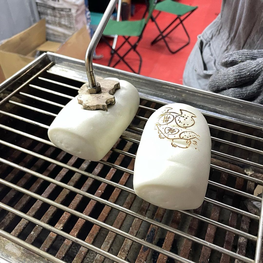 ▼饅頭還會烙上可可愛愛的烙印,龍龍吉祥物的屁股蛋竟然本身就是一份炭烤饅頭,也太古錐了吧!