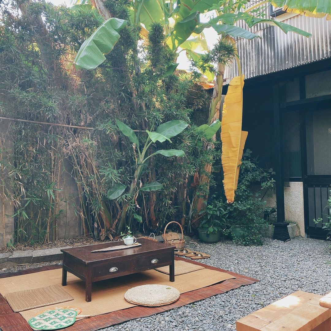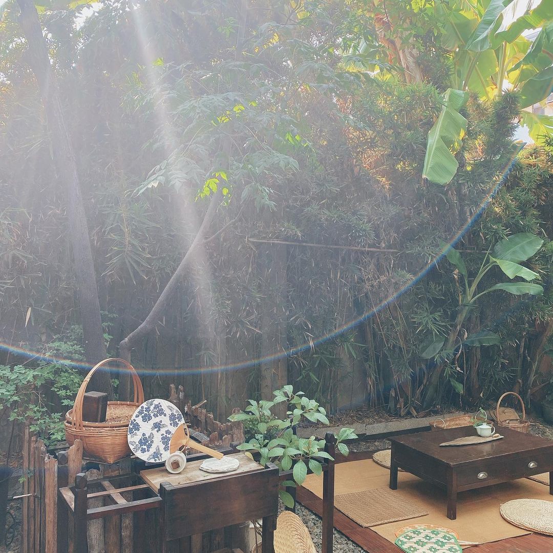 ▼經過中庭用餐區,瞬間有種來到日本秘境的感覺~兩側的綠蔭搭配竹編桌、木製椅,枝葉中還會有光影灑落,微風徐徐的吹拂完全讓人放鬆。