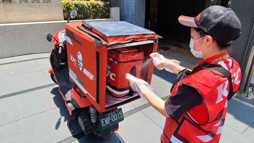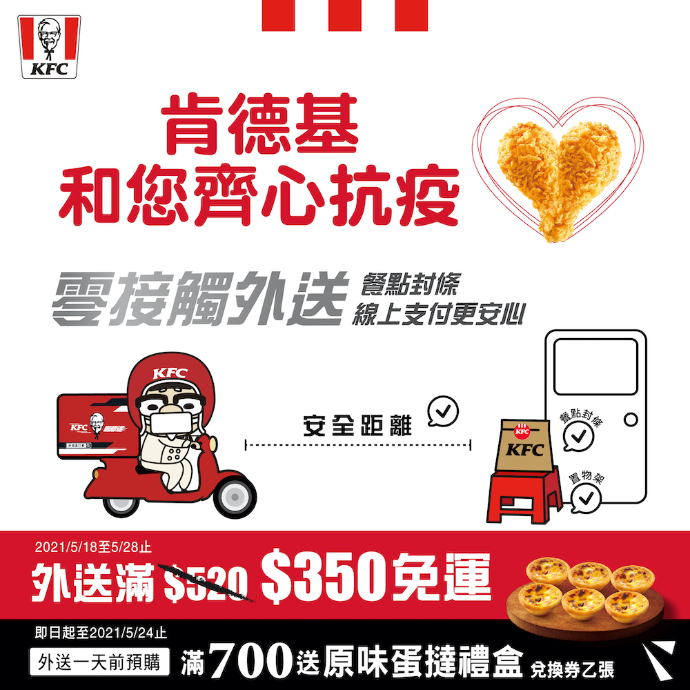 ▼而肯德基「零接觸外送服務」,可指定將餐點「放在(家)門口」、「管理室/警衛室代收」或是「戶外定點取餐」,外送餐點皆會貼上餐點封條封口,外送人員送達時將餐點放在置物架上,以降低停留、接觸時間。即日起至5/28,外送滿350元即享免運費。5/24前外送前一天預購,消費滿700再送原味蛋撻禮盒兌換券一張。