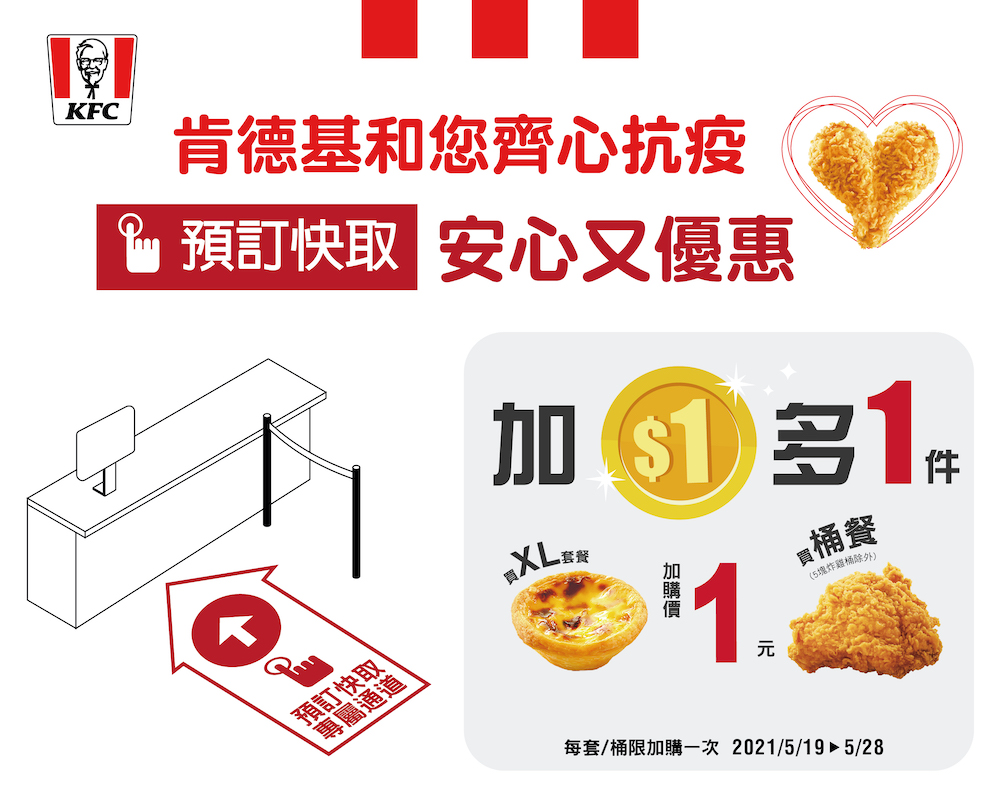 ▼同時肯德基也推出優惠活動推廣預訂快取服務,即日起至5/28利用預訂快取點餐,凡購買任一XL套餐,加1元即可享多一件原味蛋撻(市價35元);凡購買任一桶餐(5塊炸雞桶除外),加1元即可享多一件咔啦炸雞(市價58元)。(每套餐/桶餐限加購一次)