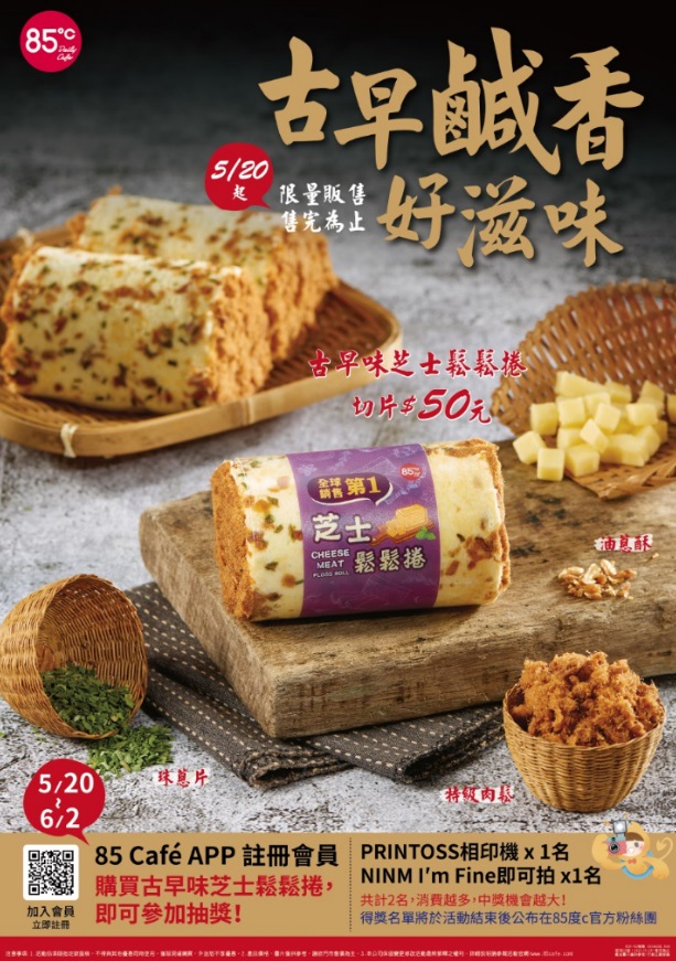 ▼古早味芝士鬆鬆捲單個售價50元,即日起全台85℃限量販售,售完為止,到6/2以前,還有加碼好禮,只要使用85 Cafe APP註冊會員購買古早味芝士鬆鬆捲一個,就可以參加抽獎,獎品有PRINTOSS相印機和NINM I′m Fine即可拍各一台(共兩名),買愈多次中獎機會越大。