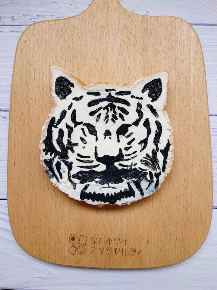 ▼這位巧手媽用奶油起司為基底鋪滿一層後,再用加入食用碳粉後變成黑色的練乳來畫出老虎的斑紋;參照網路上水墨老虎的畫,利用簡單的線條勾勒出帥氣的白虎。重點是由於原料為奶油起司+練乳的關係,這吐司吃起來就是香香甜甜,跟外表一樣超療癒~