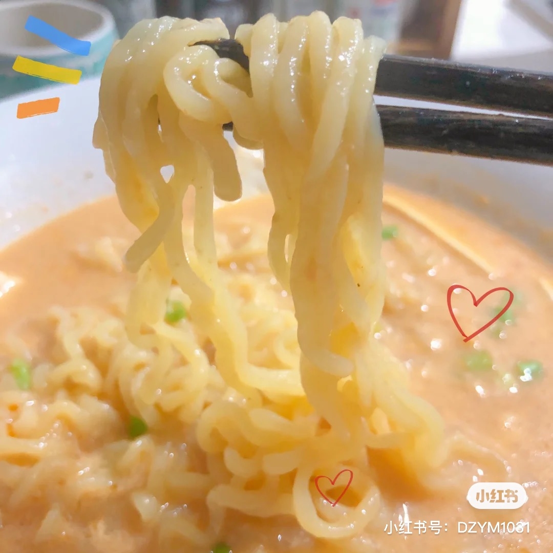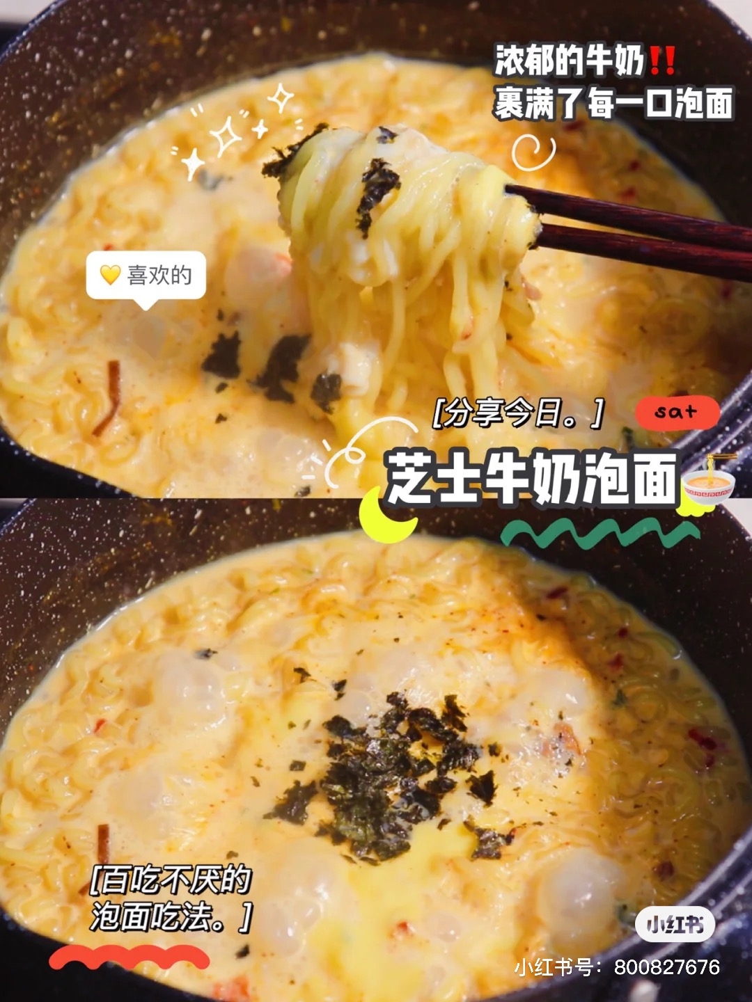 ▼做法:將泡麵煮1分鐘後,將煮麵水倒掉,加入牛奶繼續煮,然後再加入醬料包和蔬菜包。