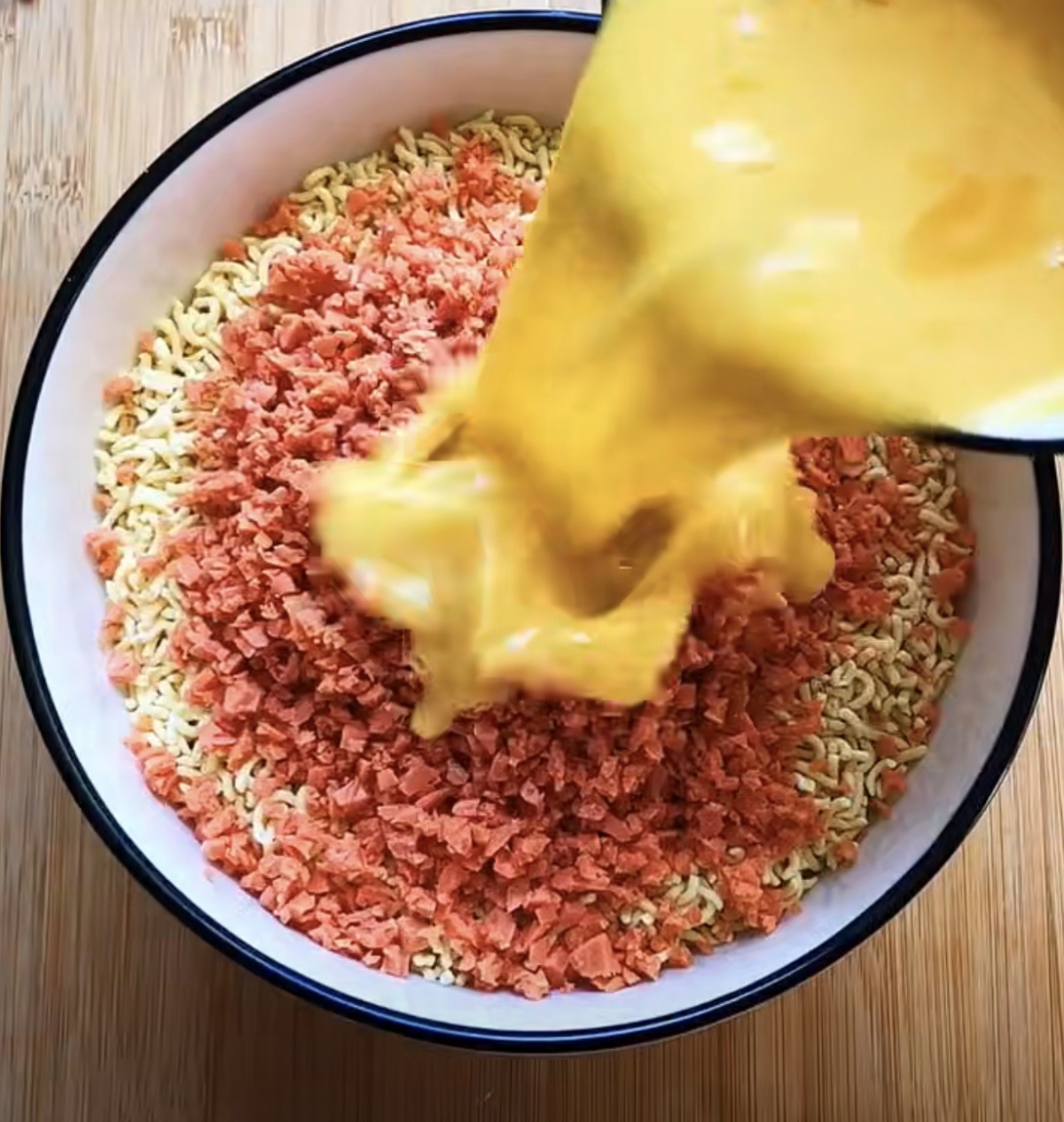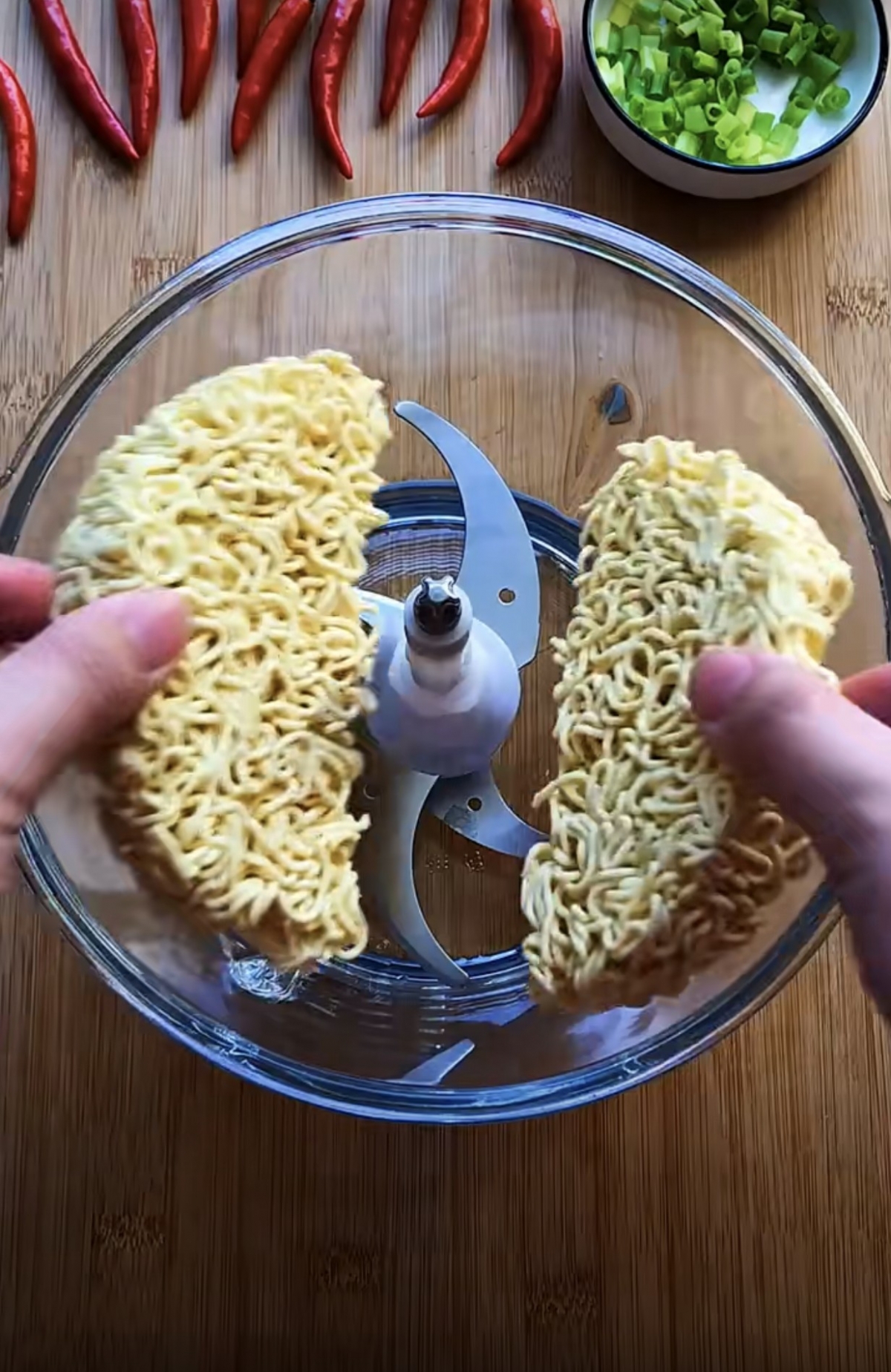 ▼做法:將兩塊泡麵放入食物調理機中打碎,加入絞碎的熱狗和4顆生雞蛋,拌均勻成麵糊狀,再放入平底鍋煎成圓餅狀。