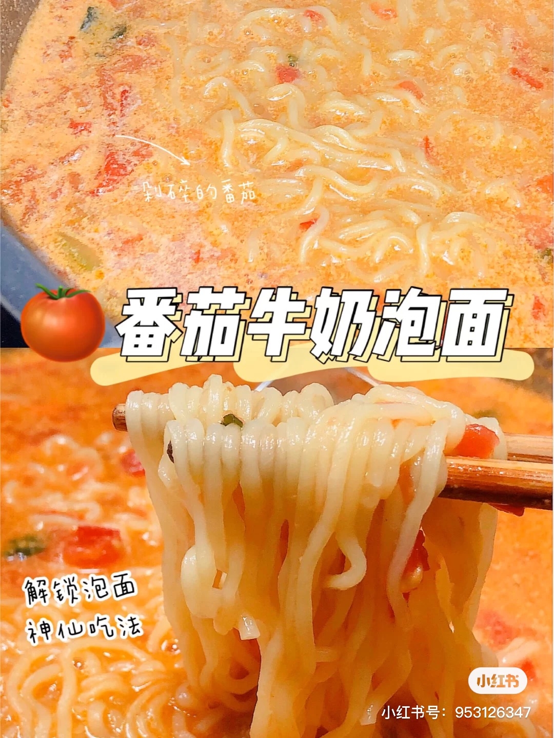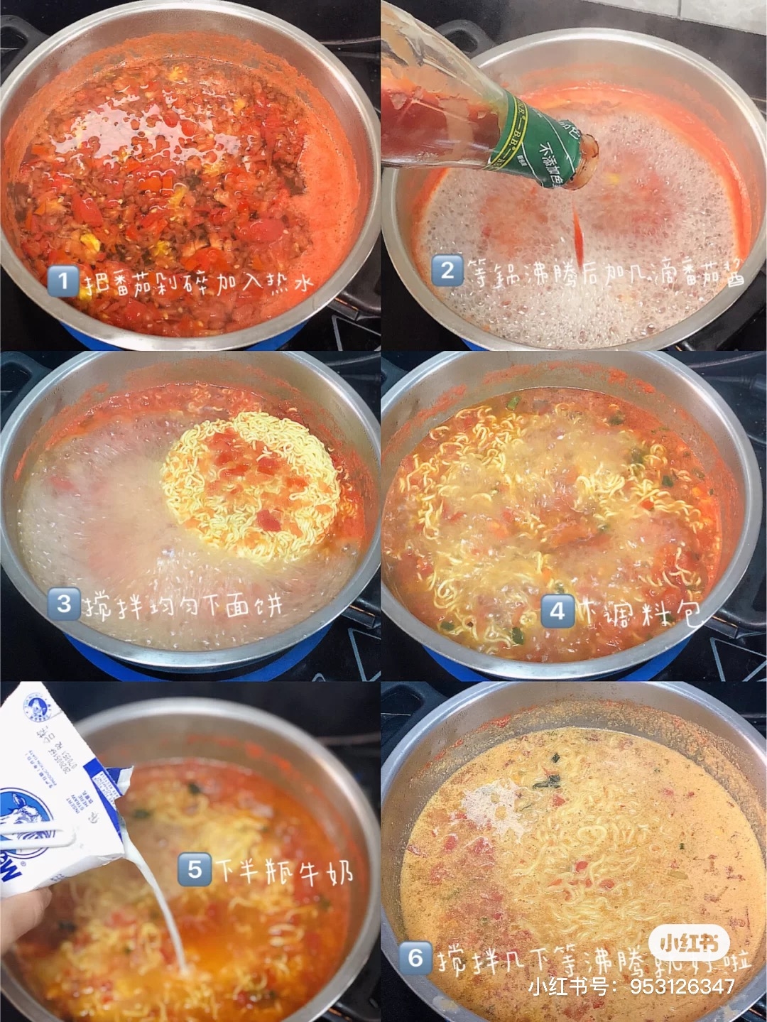 ▼做法:先將番茄剁碎、以熱水煮出香味和色彩,水滾後加番茄醬增加油味,然後放入泡麵和調味包攪拌煮勻,並且加入半盒牛奶增加奶香,煮滾後就可以起鍋享用。