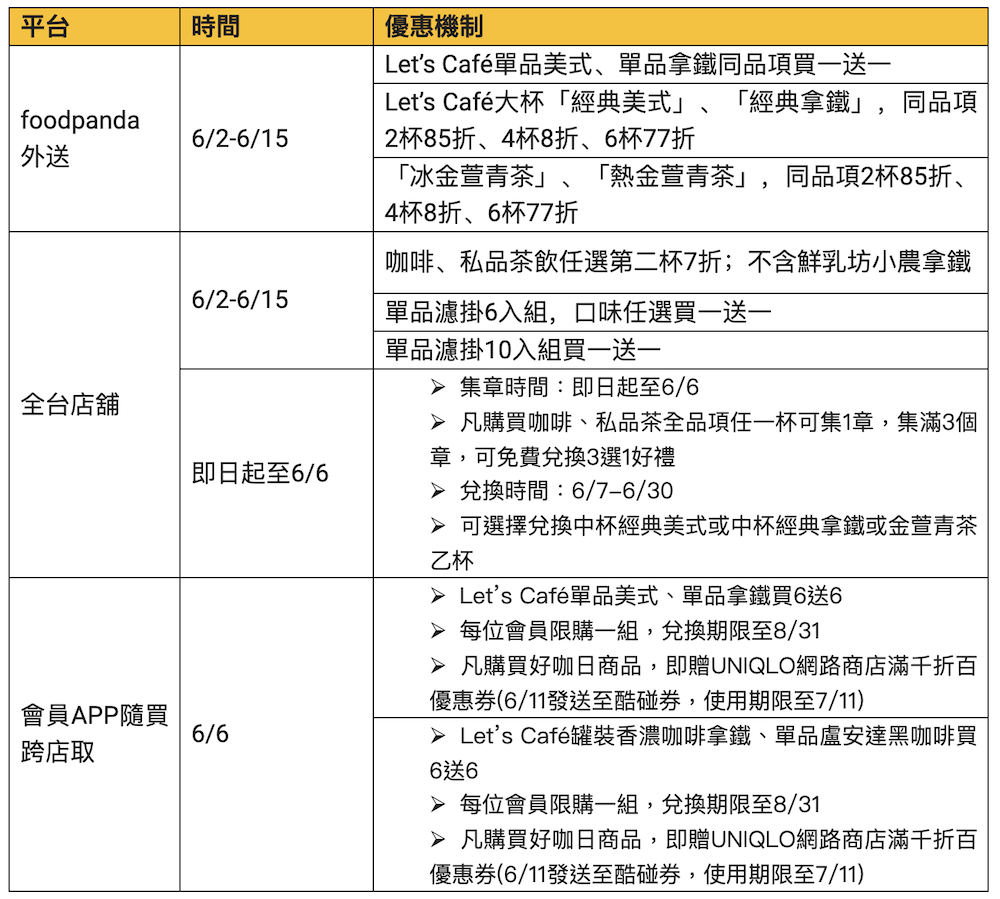 ▼不出門也能補充咖啡能量!全家便利商店和外送平台foodpanda合作,自6/2起至6/15推出Let’s Café咖啡、私品茶三大優惠方案,除「單品咖啡」系列買一送一外,經典美式/拿鐵、茶飲系列也都有優惠。