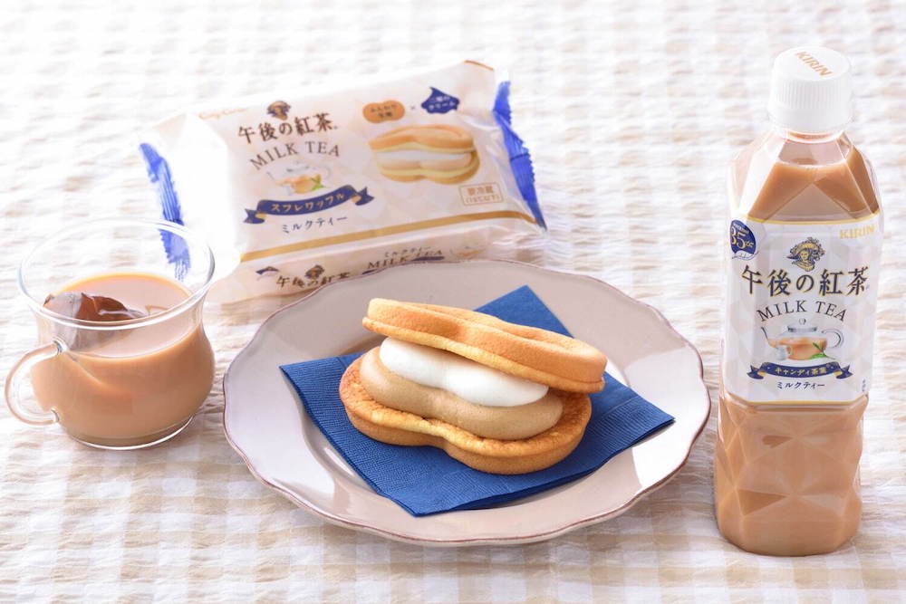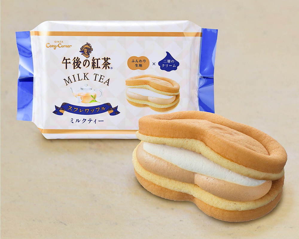 ▼除了跟森永合作推出的冰淇淋夾心三明治以外,還有和日本人氣甜點店「銀座Cozy Corner」合作推出的舒芙蕾華夫鬆餅,同樣是療癒奶茶口味,每個216日圓(約新台幣55元)。