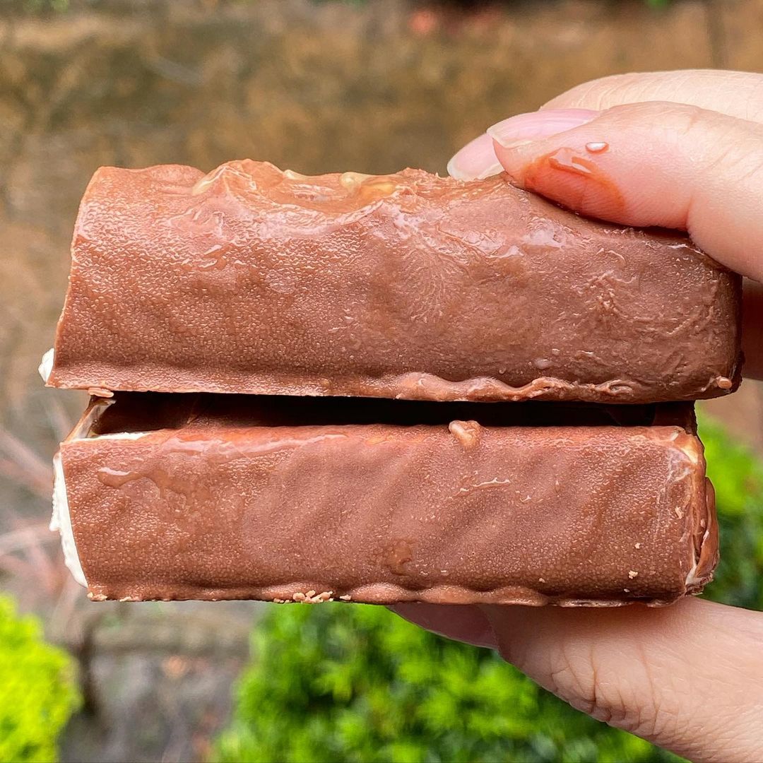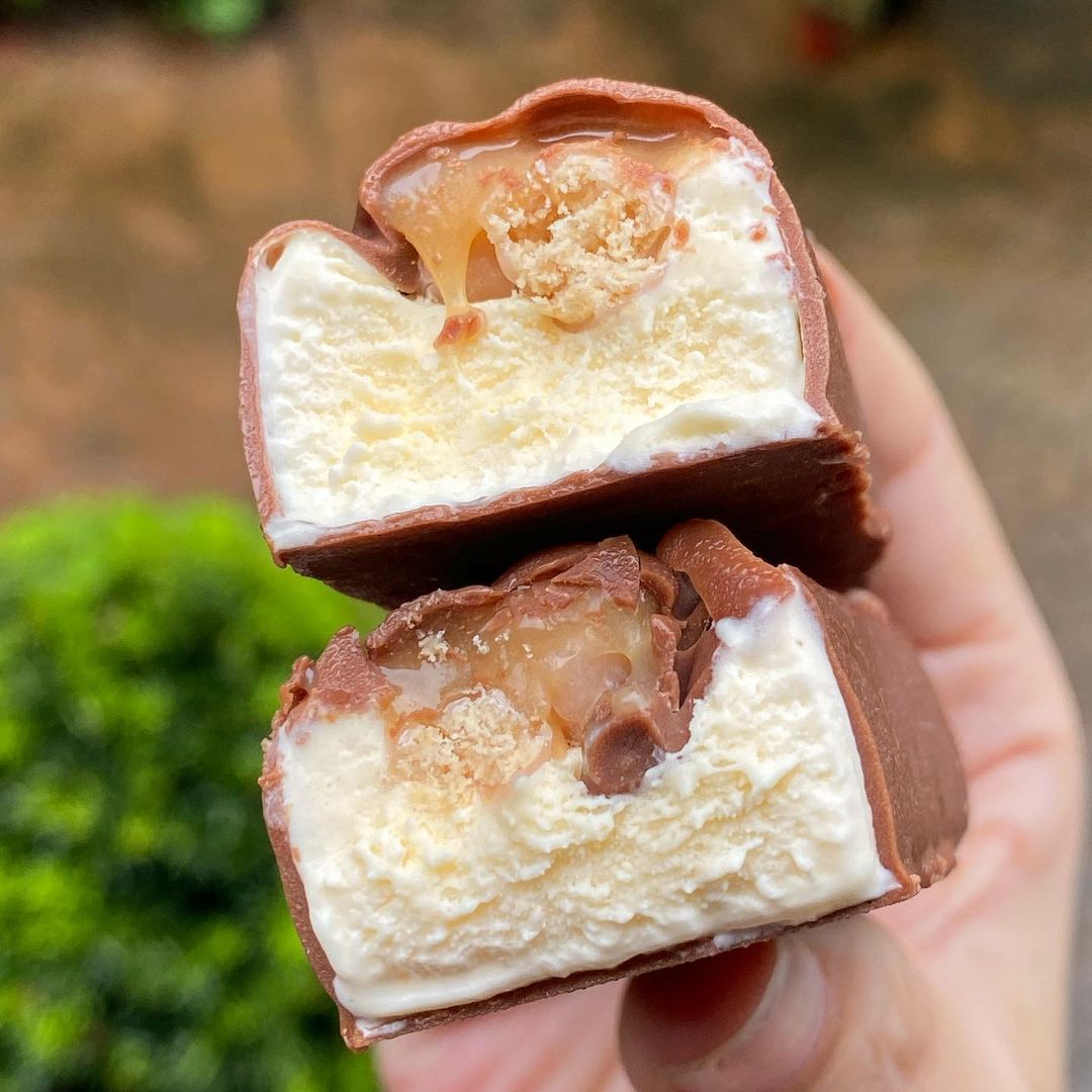 ▼外層使用大家熟悉的牛奶巧克力包裹,內餡是滿滿的香草冰淇淋,一口咬下還流出濃郁焦糖醬,酥酥脆脆的口感則是點綴在內餡裡的特趣餅乾,讓整體滋味跟口感都變得更豐富。