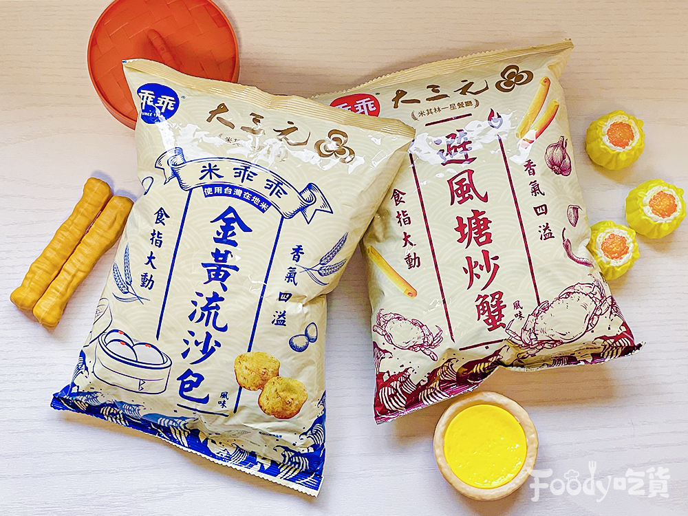▼全通路獨家「乖乖薯條避風塘炒蟹風味」,是乖乖與米其林一星餐廳「大三元酒樓」聯名,把全新薯條餅體融合經典粵菜「避風塘炒蟹」風味,香辣可口;而另一款「米乖乖金黃流沙包風味」,新造型仿干貝餅體搭配濃郁奶黃,層次口感豐富。(各45元)