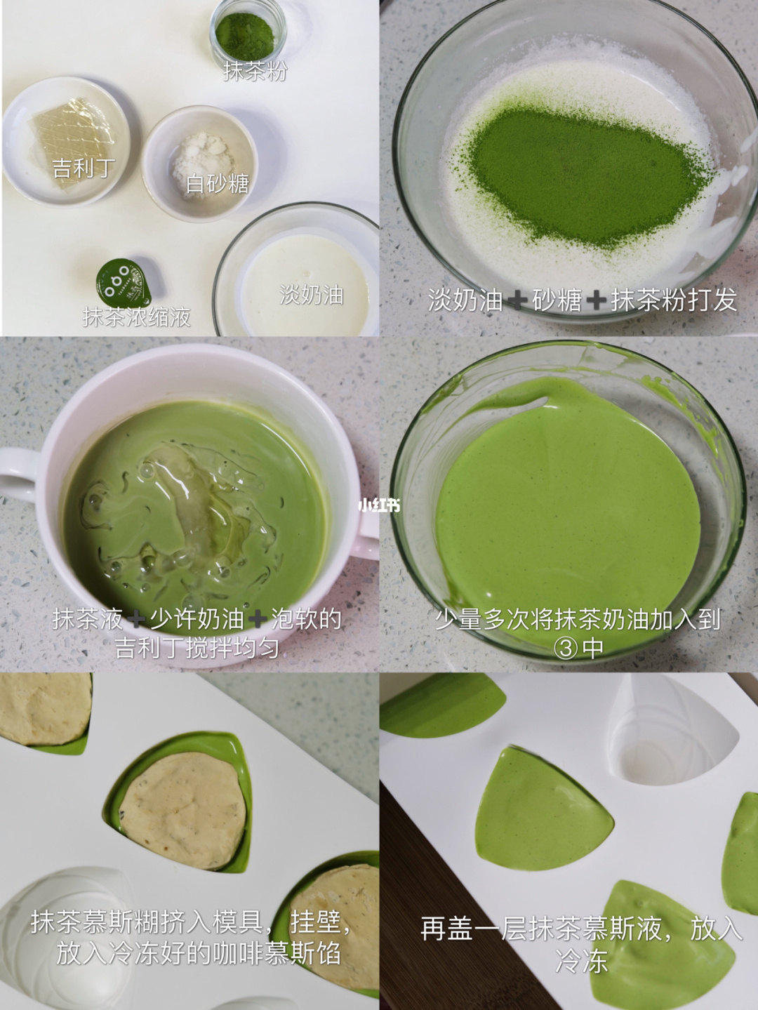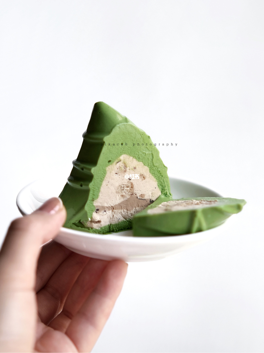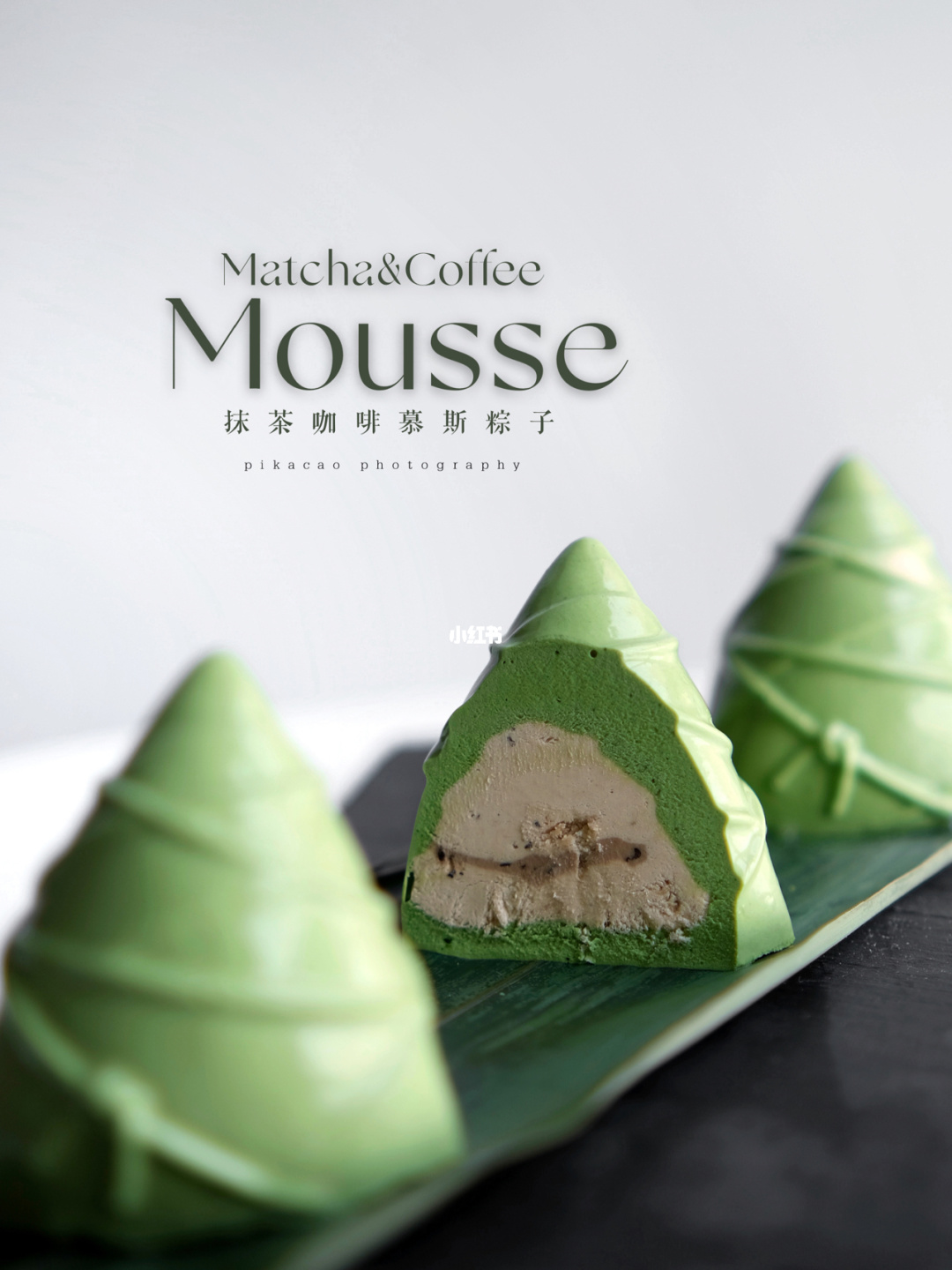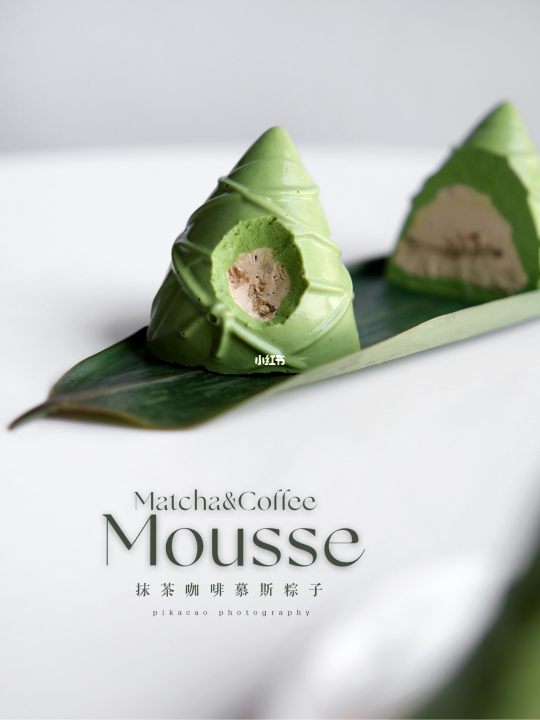 ▼再來就是外層粽葉的部分,與內餡做法相同,只是濃縮咖啡的部分改成抹茶粉,然後把冷凍過後的咖啡慕斯和製作好的抹茶慕絲再次填模一次,冷凍完就出現了超可愛的粽子甜點~