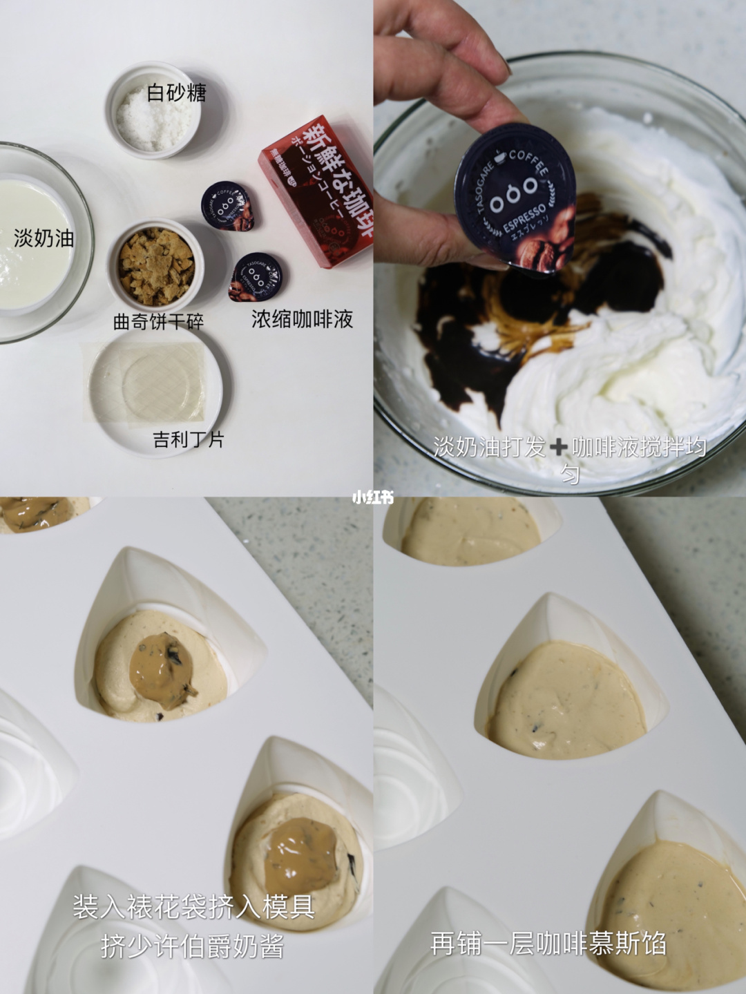 ▼「抹茶咖啡慕斯粽子」的做法相當簡單,將淡奶油和砂糖打發至7成,加入濃縮咖啡拌勻,而事前泡軟的吉利丁加入奶油,將兩者分次混合,最後加入一些曲奇餅乾碎片增加口感,把慕斯填入擠花袋,擠進粽子的模具,放入冰箱冷凍3小時以上咖啡內餡就算完成了!