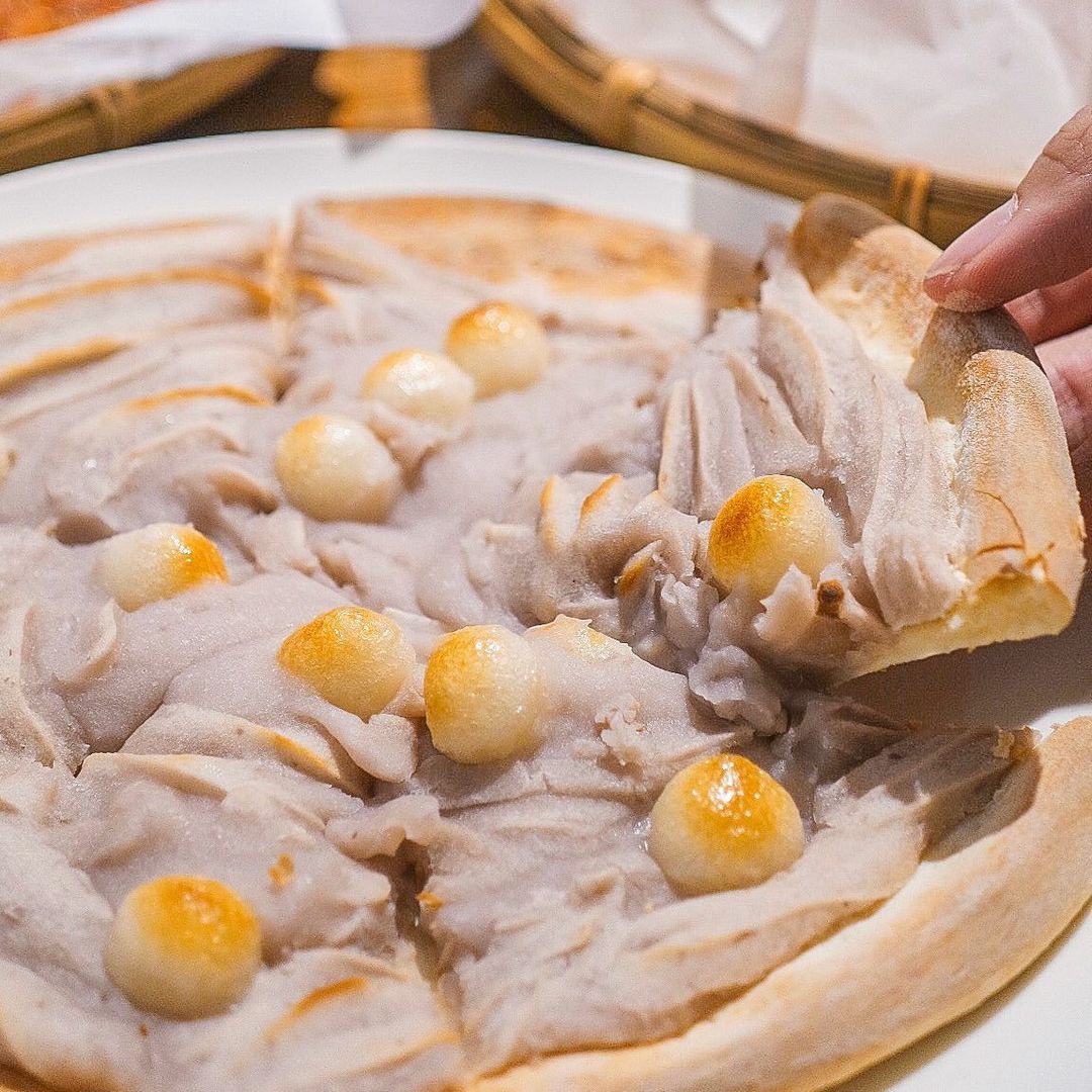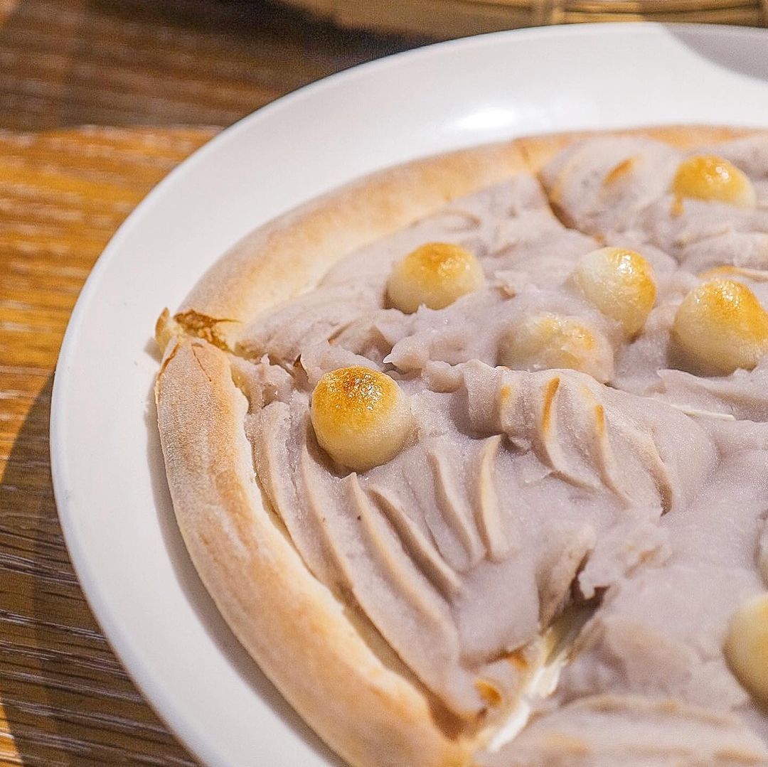 ▼另一款讓人欲罷不能的是一道甜披薩,也是許多人來吃必朝聖的口味就是「只想芋見泥」,看到這名字相信芋泥控都已經知道怎麼回事惹~在披薩餅皮上塗上厚厚一層芋泥,搭配QQ白玉湯圓一起烤,湯圓變成微焦酥脆的外酥內軟口感,搭配熱熱的超後芋泥與披薩麵粉香,竟然真的超級搭!