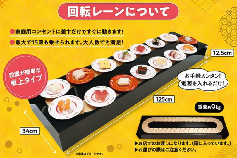 ▼轉送帶的出租期限是2天,整體設計非常簡單,能直接放置在自家餐桌上。當中還包含15道與餐廳相同的盤子與餐點,讓消費者在家中就有「現場吃迴轉壽司」的臨場感。