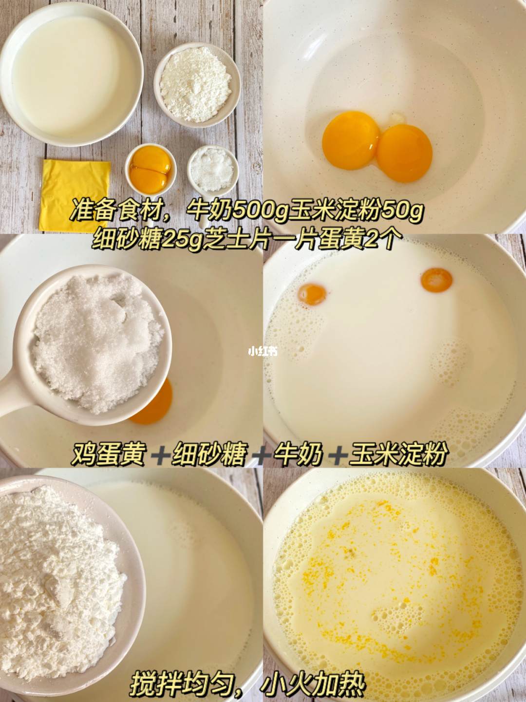 1. 將蛋黃、細砂糖、牛奶、麵粉全部和在一起後均勻攪拌,並開小火慢慢加熱