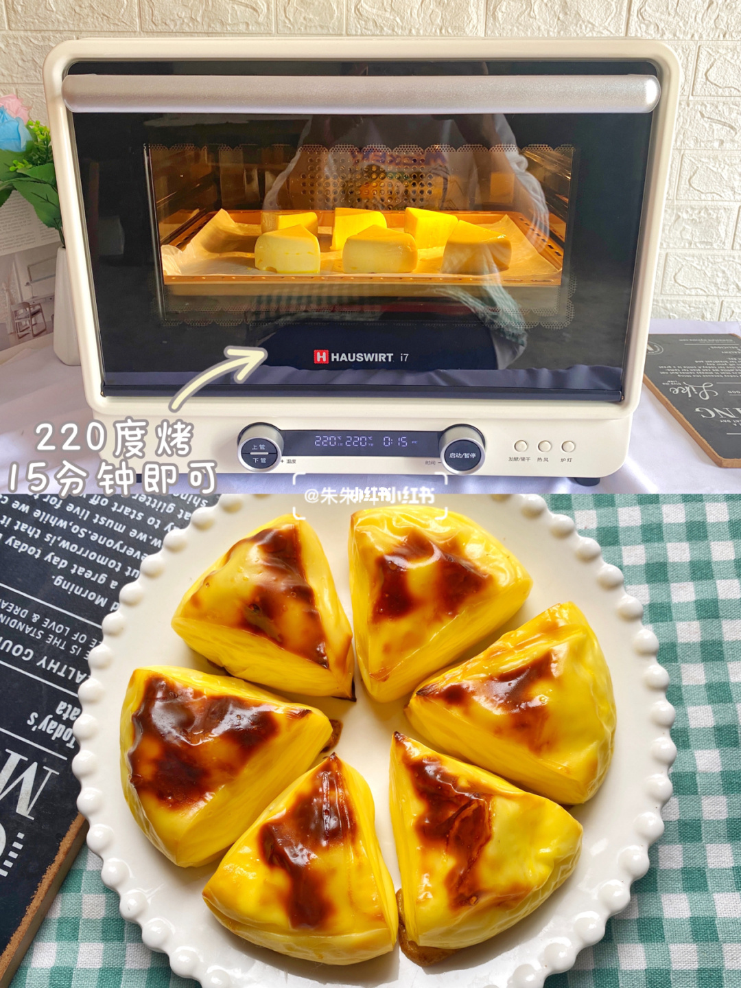 3. 取出來將整膜的蛋糕切塊,並在上面刷上一層薄薄的蛋液,並放進220度的烤箱,烘烤15分鐘後即可