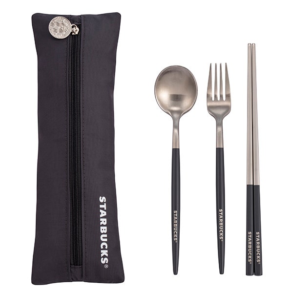 ▼除了美食,星巴克還推出了多款設計感十足的商品。比如前段時間超熱賣的提袋,就推出了全黑版本。招牌女神Logo變成黑色,搭配袋身不同的深淺,看起來很有質感。另外環保餐具也推出了黑色握柄搭配銀色餐具本體的款式,配上黑色布面袋子簡約時尚。