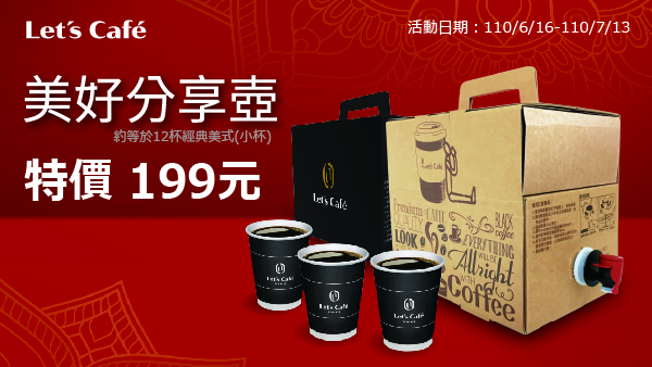 ▼為鼓勵還是需外出辦公的上班族,為減少賣場群聚,6/16-7/13推出美式咖啡美好分享壺特價199元,容量相當於12杯小杯經典美式,換算下來約有8oz*12=96oz的咖啡(約2.8公升),容量足保溫好,一次就為辦公室同仁購足一天的量~6/16-7/13同步再推出單品咖啡會員限定價,單品美式49元、單品拿鐵59元優惠價。