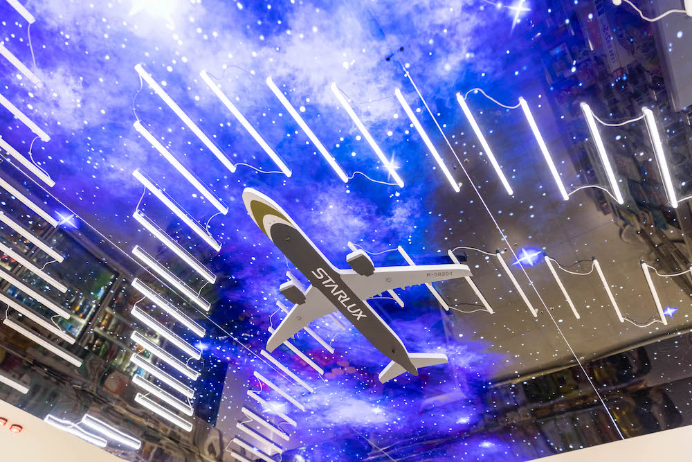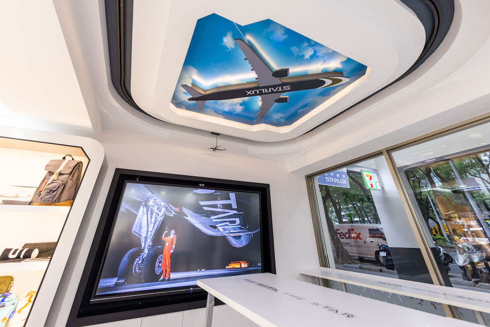 ▼另一側則是門市最大亮點,不僅有飛機場模型的主題桌,天花板更以立體裁型飛機燈板,搭配可隨燈光變換白天黑夜的天空背景,外圍還有飛機模型環繞著軌道運行,彷彿翱翔在高空中。休憩區旁設置星宇小舖商品販售區以及數位互動攝影螢幕,互動螢幕可以隨喜好與星宇飛機、商務艙、星探者等拍照(疫情期間將改以形象照片輪播)。