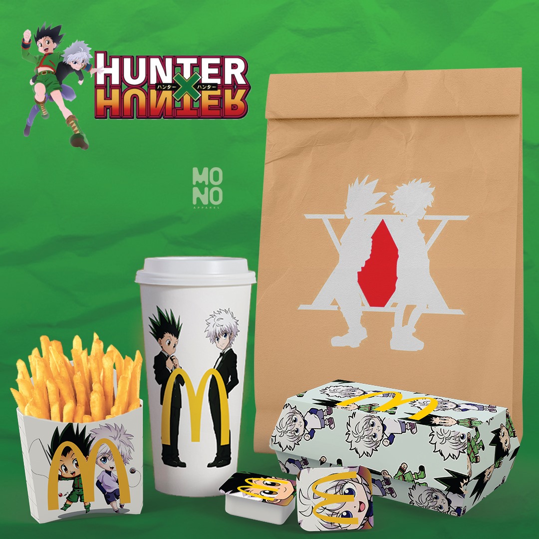 ▼經典動漫《獵人》則是從紙袋上小傑、奇犽帥氣剪影搭配獵人協會的標誌圖騰,到滿版雞塊盒Q版插畫,以及瀟灑的西裝造型飲料杯,瞬間被兩大主角帥一臉~
