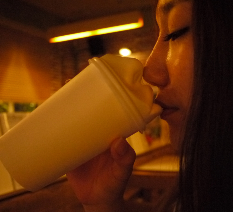 ▼開口剛好設置在杯子的厚唇上,讓喝飲料自然而然演變成親吻的動作,不要畏懼旁人的目光,就拿起他邊親邊喝飲料吧!真的太有趣了(笑)每天都跟咖啡杯蓋練習接吻,直到找到另一半那天吧!
