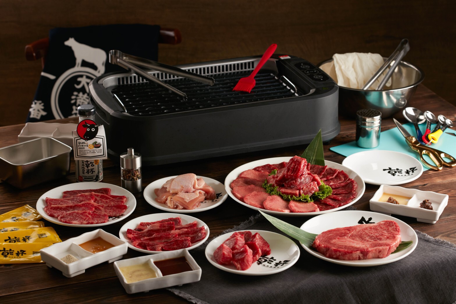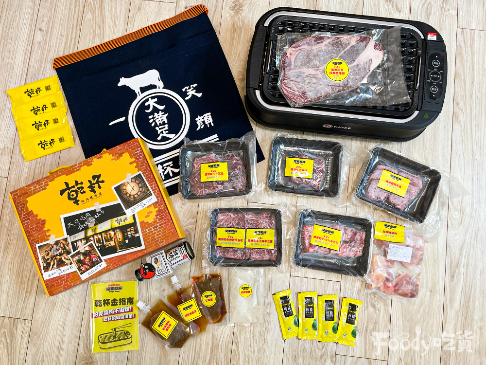 ▼在家不悶!月月「宅家乾杯」輕鬆吃和牛燒肉,只要加入定期購,入社就送你「全套烤肉設備」,從高效能的觸控式吸油煙電烤盤、燒肉夾、金剪刀、油刷、乾杯圍裙等等共14件器具的「乾杯新手包」,到月月頂級的澳洲和牛,嚴選各式部位有肋眼牛排、厚切牛舌、特選牛五花、上等角切等等,還附上乾杯燒肉醬、七味醬等8款全組調味料,超狂一條龍服務從烤肉設備到食材,通通幫你準備好,就是這麼貼心!