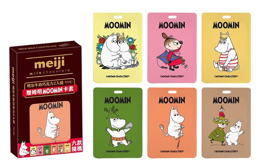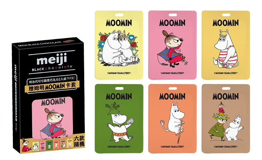 ▼便利商店通路獨家「Moomin滑蓋鐵盒-葡萄風味Q軟糖」(69元),可愛鐵盒吃完可用來收納小物;全通路獨家限量「明治牛奶巧條裝2入組」、「明治黑巧條裝2入組」(各98元),贈Moomin姆明可愛卡套,共6款造型適合收藏,可當證件套使用。