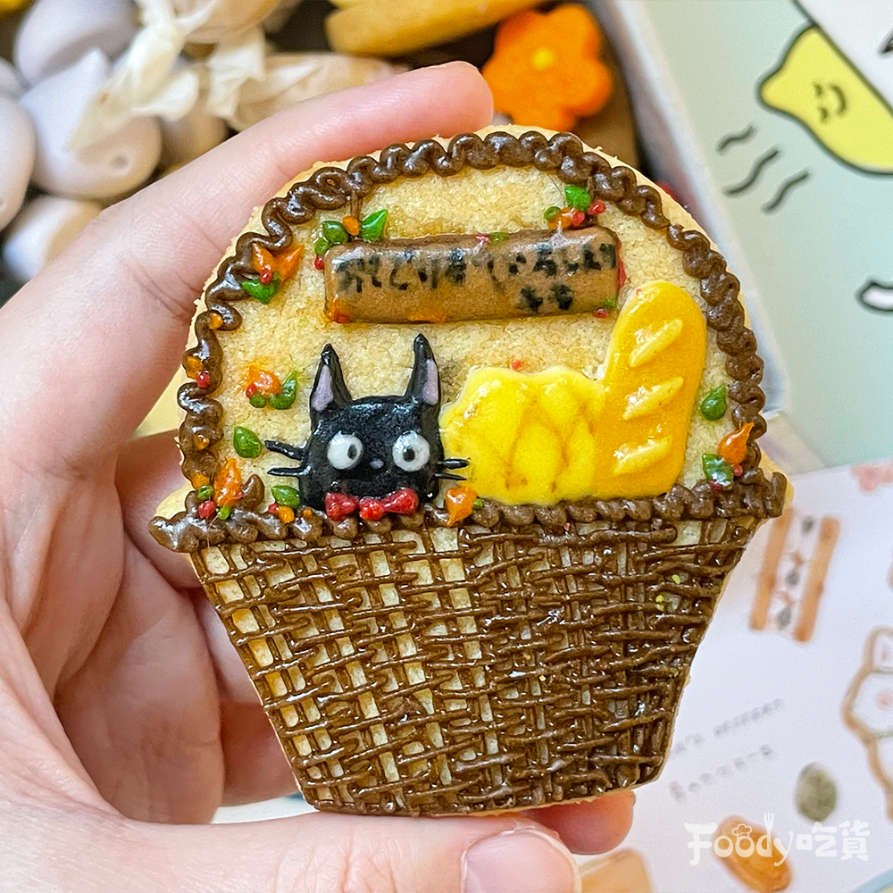 ▼最可愛的是這個麵包籃造型的糖霜餅乾,超「搞剛」畫出藤編設計,麵包旁有日系黑貓從籃子裡探出頭來,象徵著對物流人員以及日本援助台灣的感謝;可愛的小牌子上寫著「おとどけものいたします」(您有貨物到囉)小巧思也很古錐,可惜小編因為拍攝時花太久時間,字已經有點融化惹QAQ