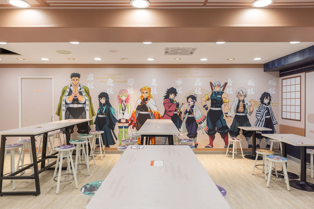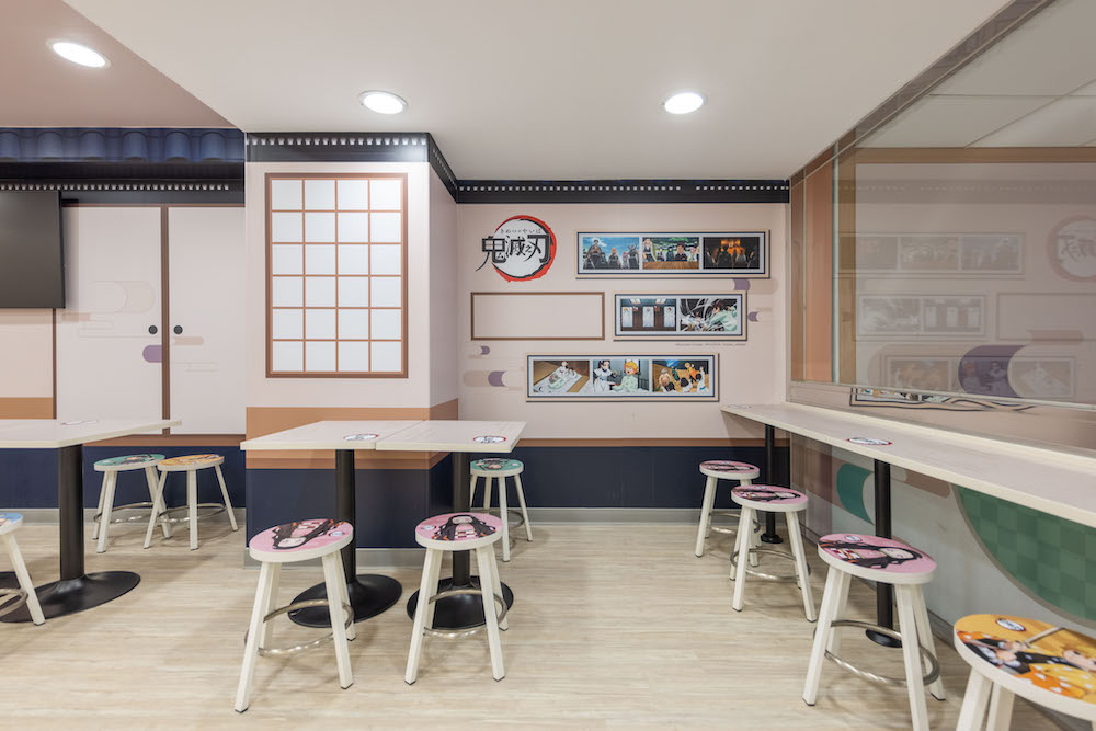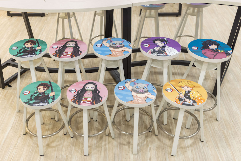 ▼冰箱上方選用動漫圖素,帶領粉絲回顧動漫中的經典劇情;2樓休憩區則以主公家為情境背景,座椅全部都是經典角色,牆面上更出現高達200公分以上的九柱成員全集合大型壁貼,讓粉絲能一次把經典角色通通拍到!