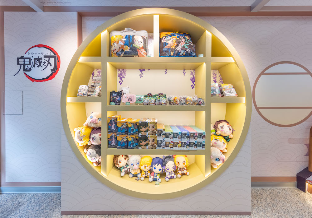 ▼緊鄰著下方是粉絲最愛的周邊商品區,背景特別選用貫穿動漫的紫藤花,唯美又神秘。另一側還有炭治郎背的特製禰豆子木箱,「開箱」後還能看到禰豆子在裡面,真實還原經典畫面。