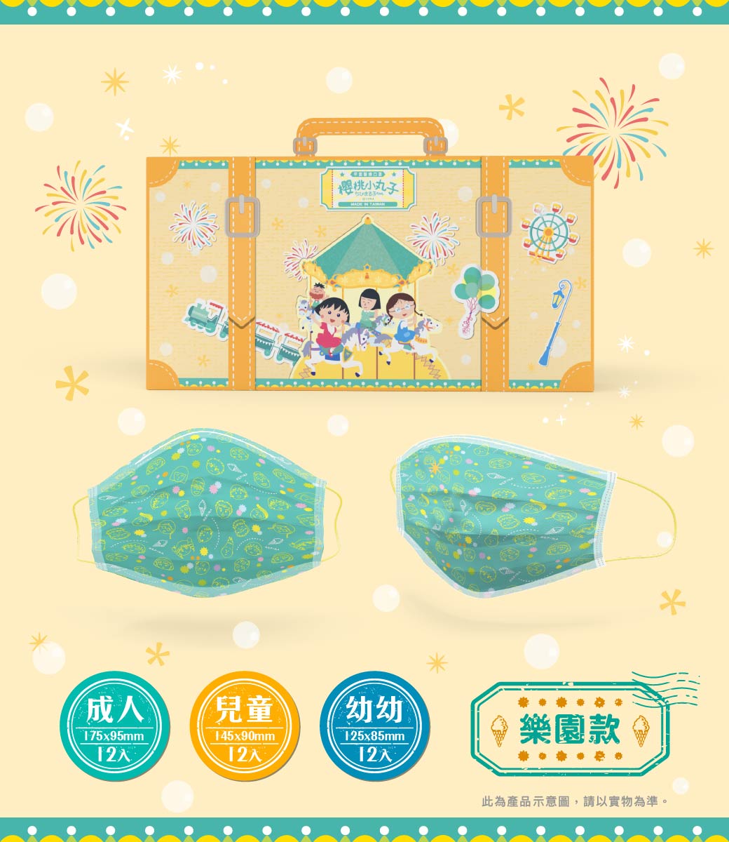 ▼「樂園款口罩」將粉嫩蘋果綠跳色搭配黃+粉色,小丸子、小玉與野口等人坐上旋轉木馬,充滿濃濃夏日樂園的歡樂氣氛。