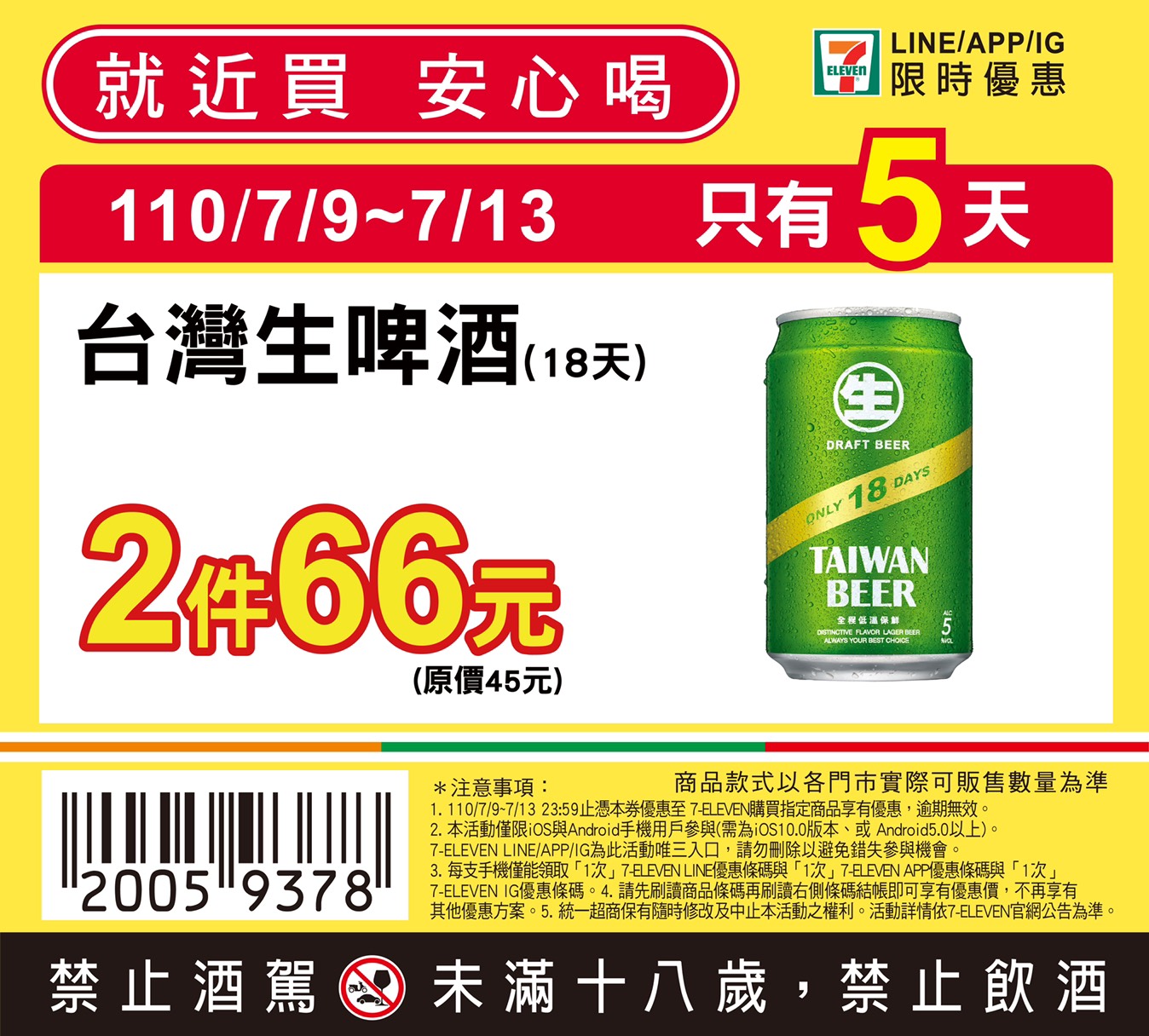 ▼台啤18天生啤酒,掌握「新鮮」準則,賞味期限只有短短18天是好喝的人氣秘訣;如今於即日起至7/13在7-ELEVEN搶先小小慶祝微解封,罐裝的「台灣生啤酒(18天)」享2件66元優惠,讓你週末先微醺小ㄎㄧㄤ,準備好迎接微解封~